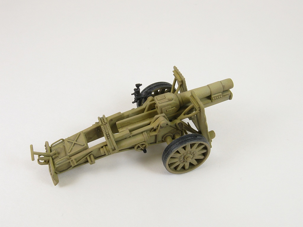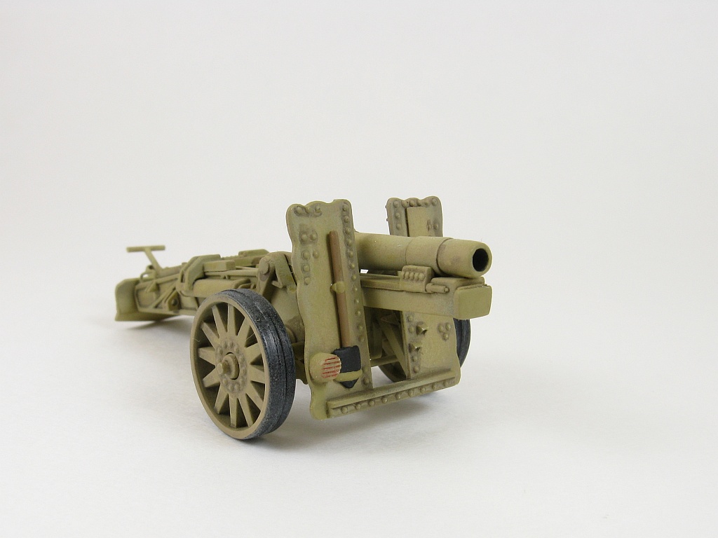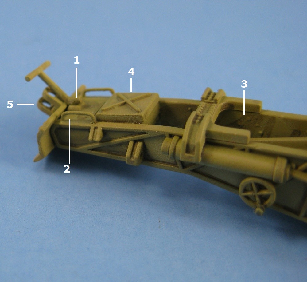 The eyes in the tow ring are a tad too small so they were drilled out and handles at the rear of the trail were added using some thin wire. Two pieces of ammunition are included. They don't look too good and if ammo is desired for the gun it would be best to obtain the sIG33 ammo