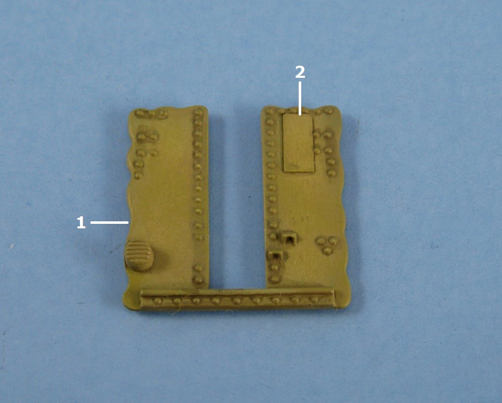 plastic sheet. Moving to the backside of the shield, there are some molded on inverted U-shaped protrusions into which one is to fit the braces (parts 22). Again I could find no reference to these so they were removed.