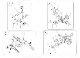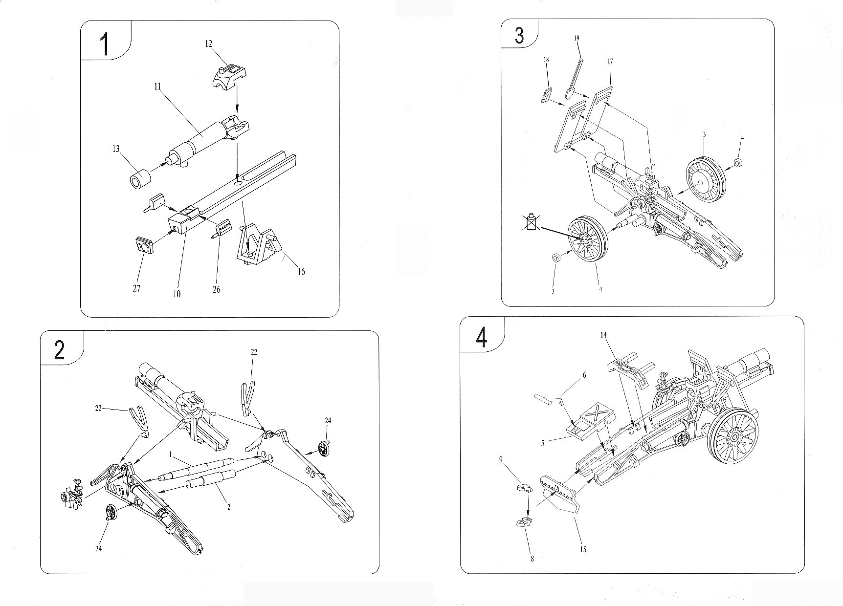 traversing & elevating wheels (parts 24) were left off to be added later. Adding the box trail parts completed the major part of the build. The cross brace (part 14) needs to have a missing panel added under