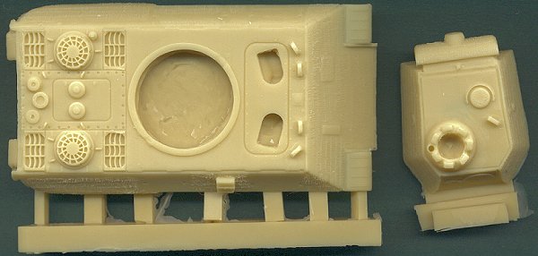 The set consists of two parts, as seen above. The hull is complete, and very simply replaces the kit hull, with the modeler only having to add the wheel and track assemblies, and other smaller details. The contour of the hull side has been corrected, the with "step" in the side armor plate better replicated here. Although I would have liked to have seen the grates on the engine fans corrected (they are currently spiralling in the wrong direction), I imagine that this would have been quite tough to do. The hull is basically that of an Ausf. D, with the second periscope for the radio operator and the early style machinegun cover plate, which was seen on very early Panther As. The turret has been modified by correcting the commander's cupola (seven periscopes instead of the six that came on the kit part) and the addition of pistol ports (with rain guards) on the turret sides and rear. The most impressive aspect of this kit is the zimmerit coating, which is done with a delicacy that I find very appealing. The pattern is very in-scale, and there are clear spots where hull stowage is to be attached. This is some of the best zimmerit I have seen on a kit in this scale. My only reservation about this set is the heavy resin plugs under the right fender. While the plugs under the sponson will be able to be removed fairly easily, I am concerned about the block attached to the underside of the mud flap. Great care will be needed to remove this without shattering the mud flap. Thank You very much to Coelian Models for sending in the review sample. |