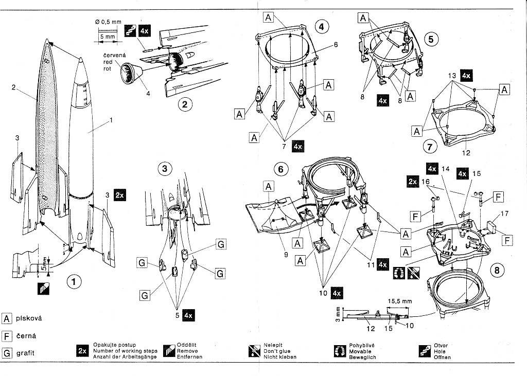 If none of these camouflage options appeal to you, then the rocket can always be painted an anonymous overall dark green as used in the latter months of the war. The colours for the splinter camouflage specified in the instruction sheet is suspect. The instructions list the three colours as green, grey and black. Web sites such as the A4/V2 Resource Site list the colours as off-white (RAL 9003), dark yellow/sand (RAL 7028) and dark green (RLM 71).