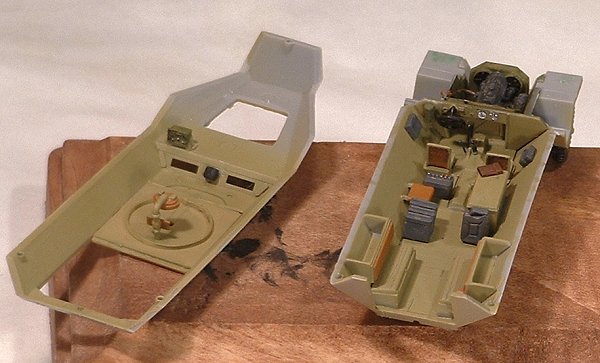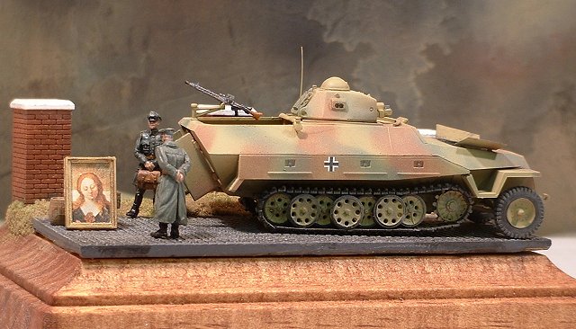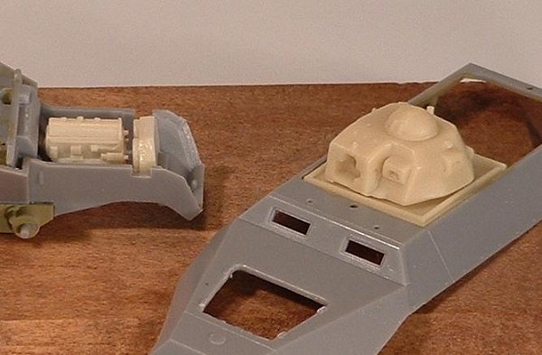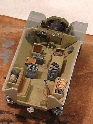 ![]() The Sd.Kfz 251 armoured halftrack (often referred to as the "Hanomag", although Hannoversche Maschinenbau-Anstalt und Eisengiesserei was only one of the firms involved in its production) was first issued to German troops in the spring of 1939 and first employed operationally in Poland. The 251 design was quite innovative, and probably deserves at least part of the credit for the success of the "Blitzkreig" strategy which served the Whermacht so well in the first half of the war. It allowed German troops to accompany the fast moving panzer columns while affording them some measure of protection. This made the halftrack superior to trucks but cheaper and faster than fully tracked personnel carriers. During the war, approximately 16,000 251s of all marks (A, B, C and D) were built, with production continuing in Czechoslovakia for some time following the end of the war. The majority of the vehicles built were model "D", comprising more than 10,500 of the total 16,000. The 251 served with panzer grenadier, reconnaissance, artillery, and specialist units on all fronts in a variety of configurations. The basic design was adaptable to wide range of functions, including anti-aircraft, engineer and communication/command. In addition to the more than 20 factory built versions, there are also a number of known field modifications, which reflect specific needs or the availability of local resources at the time. The vehicle I have chosen to model is one of those field modifications, with the turret of a Renault R35 light infantry tank mounted over the passenger compartment. The Hasagawa Sd.Kfz 251 D Hasagawa's 251 D is a very nice kit on its own. The moulding is sharp and the dimensions seem quite good. It is also, of course, the first small-scale version of this important vehicle produced in plastic. It is available in three major versions, the 251/1 armoured personnel carrier, the 251/9 heavy support vehicle (with short 75mm gun), and the 251/22 late war self-propelled anti tank gun. The build itself is quite straightforward. There is a reasonably detailed interior provided in the original kit, with an instrument panel, seats, a radio and the steering wheel mounted above the drivers seat, angled downward, as on the real vehicle. I painted the entire interior dark yellow before adding anything. After assembling the basic detail, I first added the Extratech engine compartment detail, which I will describe below. In the drivers compartment I used the Osprey Sd. Kfz book as a guide to add some more detail, mostly gear added to the side walls. To take advantage of the spring details on the back of the seats, I recommend some drybrushing - I used a gun metal silver gray after painting the frames of the seats dark yellow and the cushions reddish brown. The radio was painted olive green (according to Osprey) with the details picked out in white and black. I added three gear shift selectors (or maybe two shifts and a parking brake?) to the floor between the two seats and painted them black. The steering wheel was also painted a medium gloss black. It was at this point I realized that, with the Renault turret modification, the detail I was adding to the drivers compartment would be very difficult to see. I could choose to leave it out (which, having done most of the work already didnt appeal to me) or do a few things that would make it more visible. I chose to 1) build the vehicle with the armoured vision port open (requiring something to simulate the armoured glass inserts) and 2) open up the rear doors so a viewer could look through the back right through to the forward compartment. With that decision taken, I began adding more detail to the interior, which became a mini model in itself. With the turret, I assumed that there wouldnt be enough room inside for the forward seats. I therefore left them off, replacing them on the starboard side with the ammunition bin from the Sd. Kfz 251/9 kit and on the left with a folding jump seat, as was found in the /22 according to Osprey. I also added a few cases of ammo (from the old Fujimi Sd. Kfz 222 kit) one opened with the small shells showing. I also added a jerry can (one of the beautiful resin ones produced by Mars) beside the ammo bin and some miscellaneous gear. The two rear seats I think I added before I painted the interior. I found they are a bit thick around the storage bins in the upper part, so I thinned them a bit with an exacto. Early 251s seem to have had very nice leather covers on the passenger seats, while later in the war these were replaced with simple wooden slats to simplify production. The Hasagawa lower seats are kind of a mix of both seats. They are shaped like the early seats (sort of puffed up) but look more like the later seats, which should sort of "concave" higher at the front, low in the middle and bit higher at the back. The later ones should also show the slats. I compromised by simply scribing lines onto to the existing seats, and giving them a light wash to pick out the lines. The upper parts of the seats, the back rests, seem to have been padded in the later 251s, so I left them as is and painted them reddish brown. Finished, for the time being, with the lower hull, I super glued the resin plate over the opening in the upper half of the hull and painted it dark yellow as well. After adding the radio and a piece of kit between the two vision ports (a Prieser German mess tin), I considered what I wanted to do about the turret. The ModellTrans turret is moulded solid, with a shallow hollow area behind the hatch where you could place a figure. As such, there was no point making a hole for the turret. Instead, using a piece of plastic strip, I roughly outlined the circle where the turret would attach to the plate, so it wouldnt look quite so blank on the bottom of the mounting plate. Finally, although I have no source or historical justification for this, I assumed that there would be a hanging seat beneath the turret for the gunn