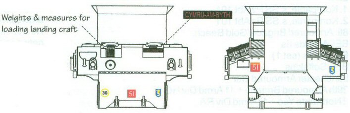 Mk III ARV CYMRU-AM-BYTH A turret less Fisher tank, it had the squared welded hoods, the cast rounded transmission cover and the “D” type antenna bracket. The tracks were the rubber T41 or T51 flat type. A well known photographic sequence shows CYMRU-AM-BYTH allocated to the LCT 610, aka 212, for the D-Day landing. I don’t have a photo which shows the LCT number; anyway it should have one of the variations described below. |