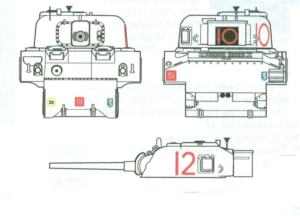Mk III T151924 “12” CHANCELLOR Sadly I don’t have a photo of “12” in Normandy. The only 13/18H “12” I’ve seen is with the 8th AB near Nijmegen in October 1944 (IWM B 10996). The font and the colour of the October numbers are different from the ones of the 27th AB time, while, logically, the Brigade marking and the AoS number also changed (and the HQ diamond is not red). Having taken the place of the 24 Lancers, I suppose the colour is yellow. Anyway the typical stowage arrangement hasn't been altered, nor the way to paint the name and the HQ marking on the hull side. I don’t know if this tank is the same D-Day veteran “12”, anyway the October tank had the bolted transmission cover and the cast hoods. The gun mount is the late M34 type. The tracks were the metallic T54E1 type. The name was TWELFTH KNIGHT, which is also given in the set (the WD number seems to be missing on the original tank too).