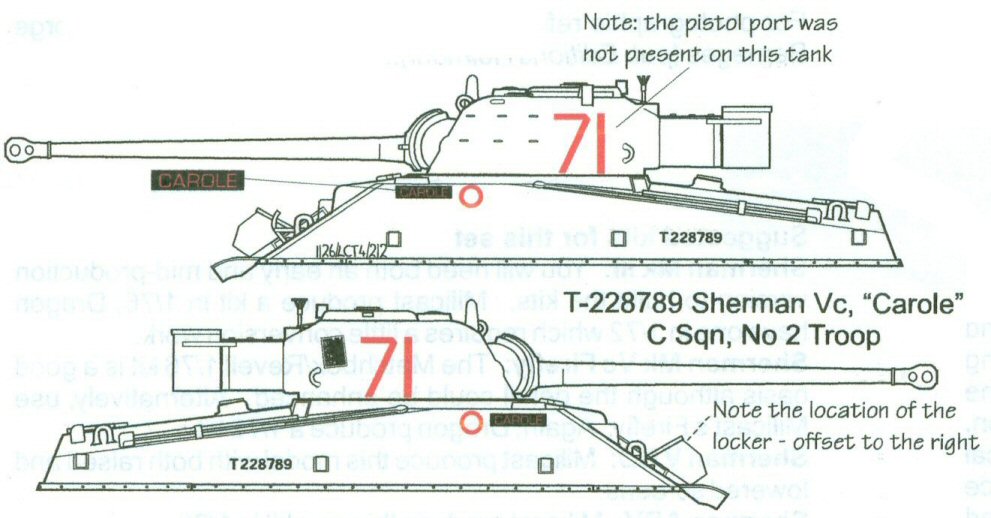| Mk Vc T228789 “71” CAROLE This vehicle didn’t have the hull appliqué armour. It had the cast hoods, the padded lifting points on the glacis and the turret with the cast-in armour without the pistol port. The tracks were the metallic T62 type. The LCT number was 1126/LCT4/212 on the right hull side and on the bin on the glacis. On the right side the WD number is dirtied, leaving only the last three digits “789” visible. |