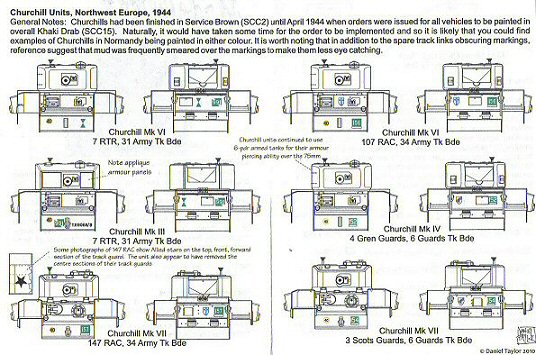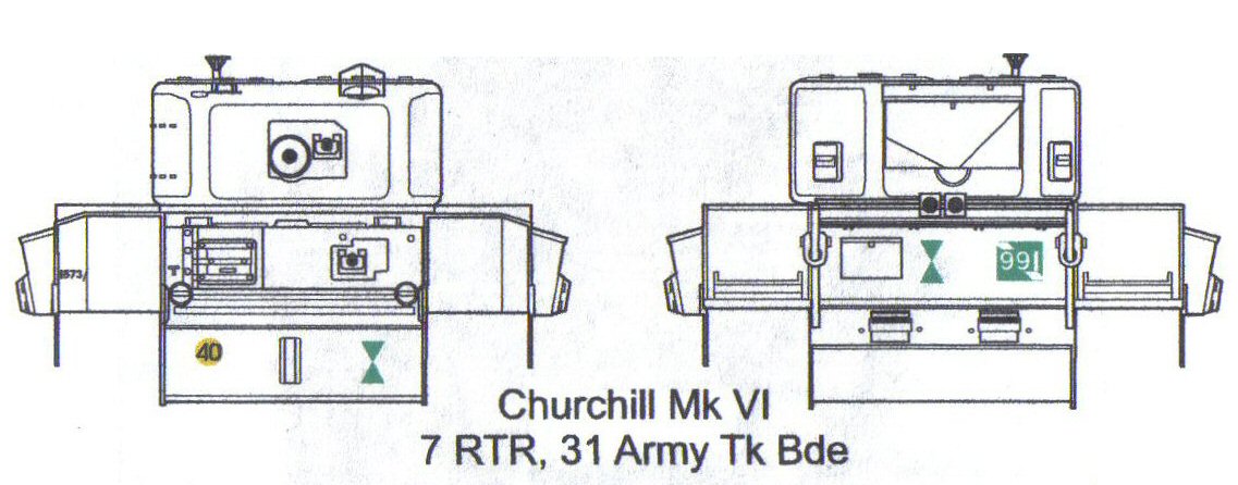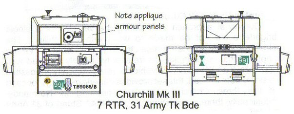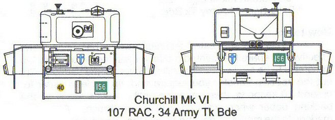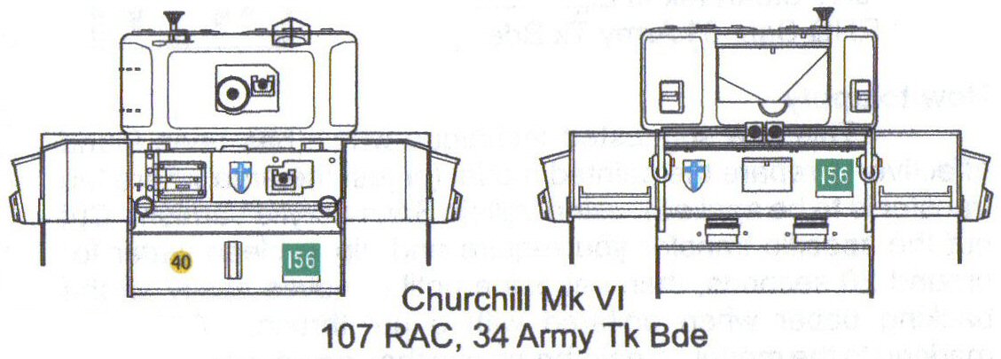 markings, troop numbers or WD numbers. A note explains why : British tanks often show a widespread use of camouflage netting, with or without the hessian tapes. If this wasn’t enough, early in the campaign, Churchill tanks often were up armoured with track lengths (taken also from other tank types, mostly Shermans) fixed or welded to the turret and on the hull, hiding most of the markings. The dust and the mud (sometimes smeared to hide the bright colours of the badge) completed the job which is why it is often difficult to identify a tank (if not impossible). |