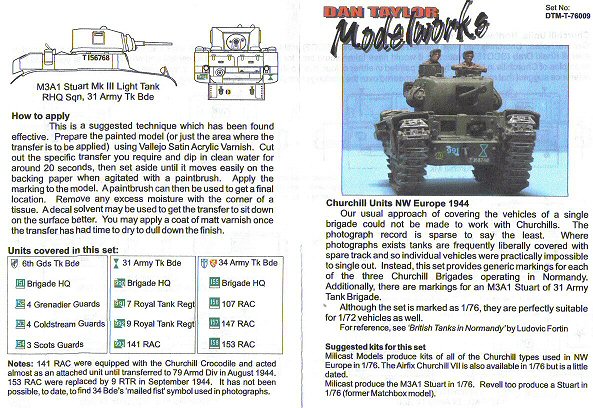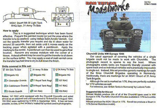 | The set is made for 1/76 scale, anyway the difference to the 1/72 is so little (about the 5%) that they are perfectly suitable for our scale. Conclusions Well, despite the absence of other markings, the set is very useful and I like it. On the other hand I like the Churchill tank, but I don’t believe I will make 33 of them. Perhaps a bit of space could have been used for some other tactical markings, WD numbers and names, renouncing to some Brigade badges and AoS. Anyway as already told, the original photos mostly show us the tank made "anonymous" by dust, dirt and other items. Highly