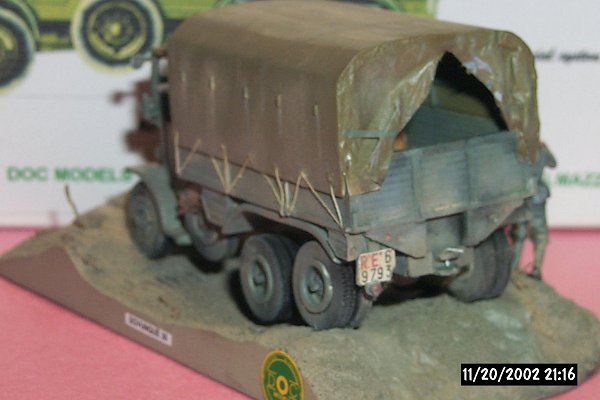 The truck colors on DOC's boxart show it in a very light olive with a light gray tarp/canvas. From several books on Italian WW2 vehicles I understand that the typical Italian colors were a gray-green for continental vehicles, and tan for African vehicles. I am sure there were exceptions to this. For example, I have one color photo of gray-green Italian Lancia trucks in Tunisia, and tan vehicles in Sicily and Russia. Often, green camouflage spots or lines were added to the tan. An overall olive-green color and German markings are plausible to me as well.