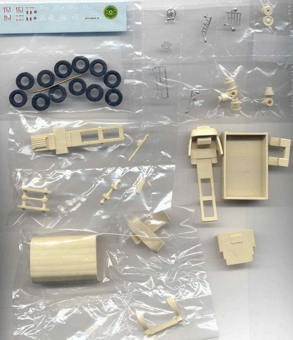 The scan above of DOC's Dovunque 35 shows the 15 injection-molded, light amber resin parts, 12 soft rubber tires, and about 12 white metal (iniezione in Italian) parts. The truck frame and bed are at the right. The tarp, or canvas, for the bed is at the lower left corner. The decals for three vehicles are at the top left. [You will note above that there are actually two truck frames shown; my kit originally came with two frames and none of the white metal parts supposed to be there. DOC promptly and graciously shipped me the missing parts after I e-mailed them.]