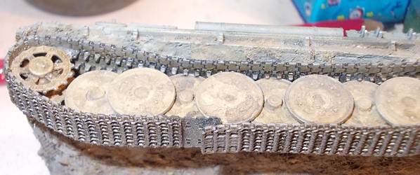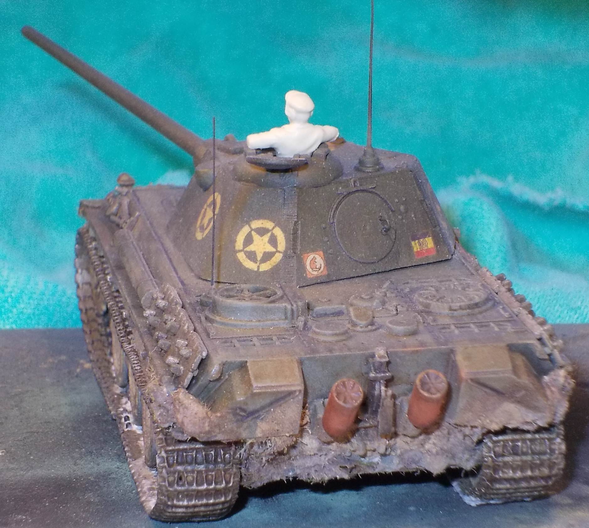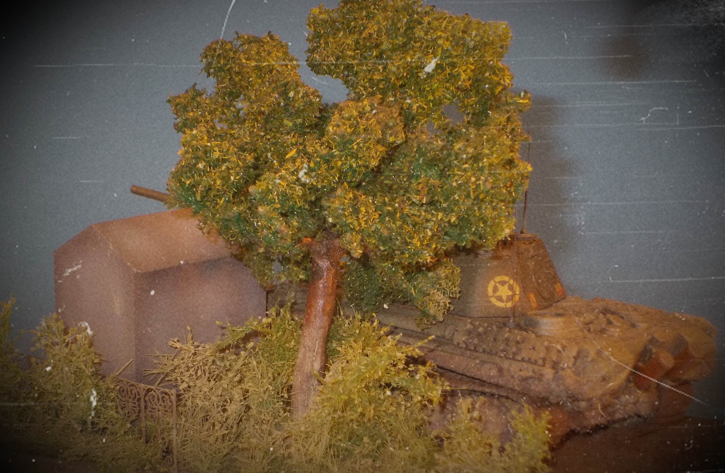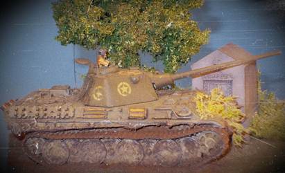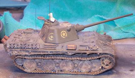 fatigue ? I could go on rambling about some other minor shortcomings of the kit, but I believe I have made myself clear by now. The kit is not a complete disaster, assuming it won't disintegrate in a couple of months, but it is typical of a new brand's first efforts, as it was at the time of this release. I am pretty sure the newer Panther kits from Dragon will be infinitely better (and more expensive). I didn't try the kit decals, as I decided to go for a "what-if" paint-job. The figure in the picture is from Milicast set n°5 (yet to painted), the stars are spray-painted using Stencilit and the decals are from Peddinghaus. In the picture aboven the tracks still need to be integrated with the dio I am preparing (which will help hide the gap). I added "chicken wire" to the front glacis to hide the ill-fitting hull. Foliage still needs to be added; dried plants will beu sed for this. The diorama