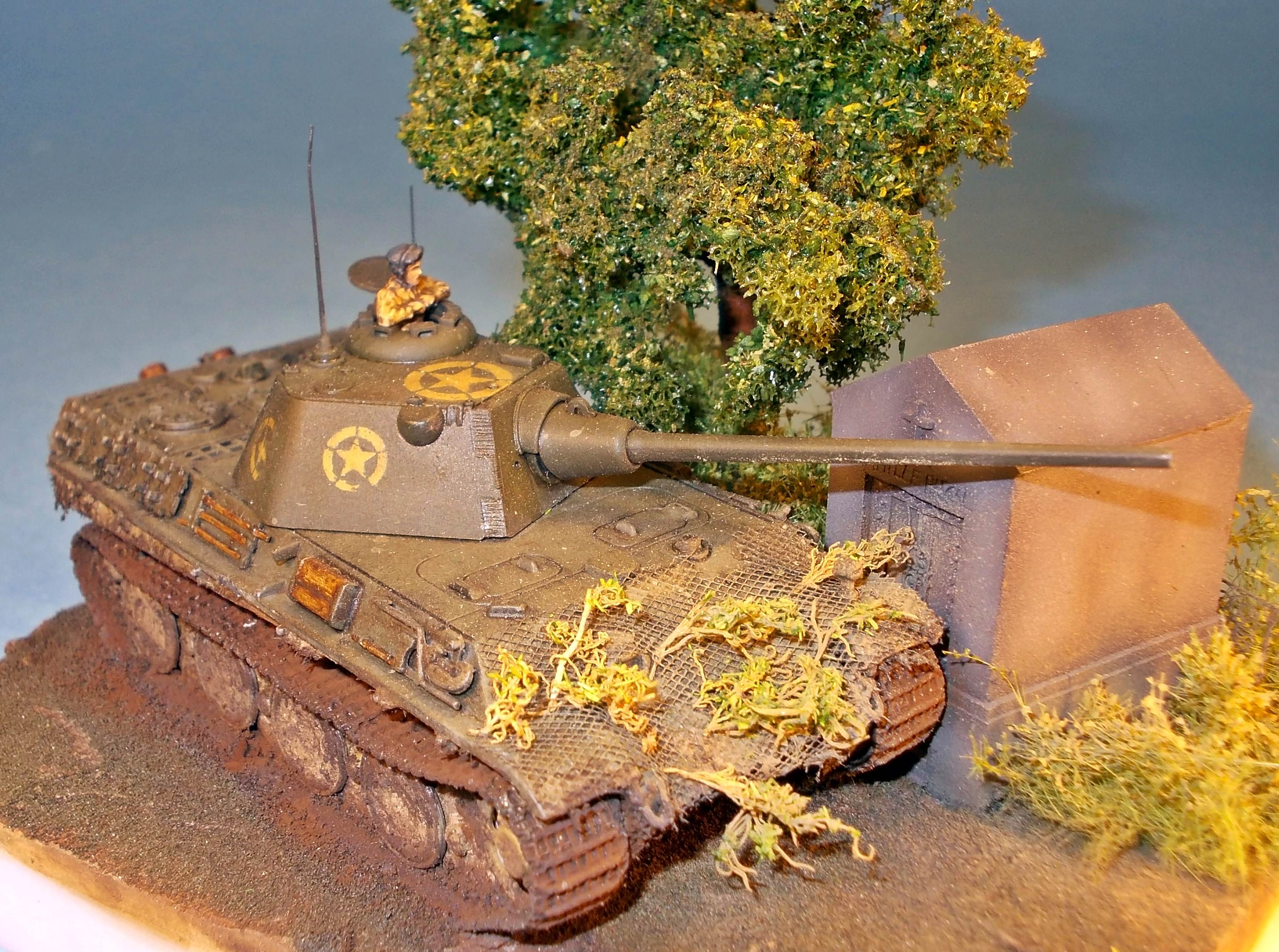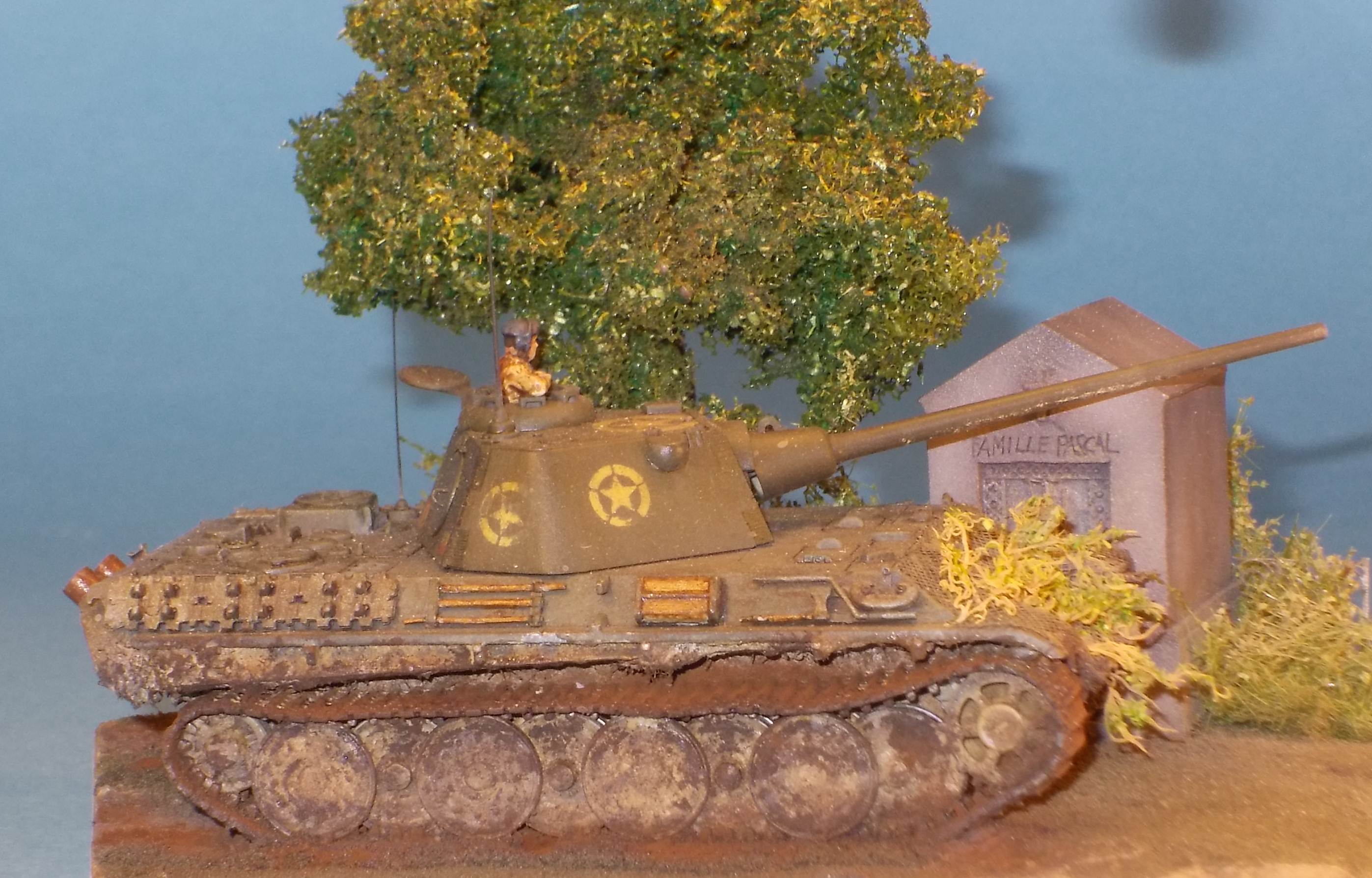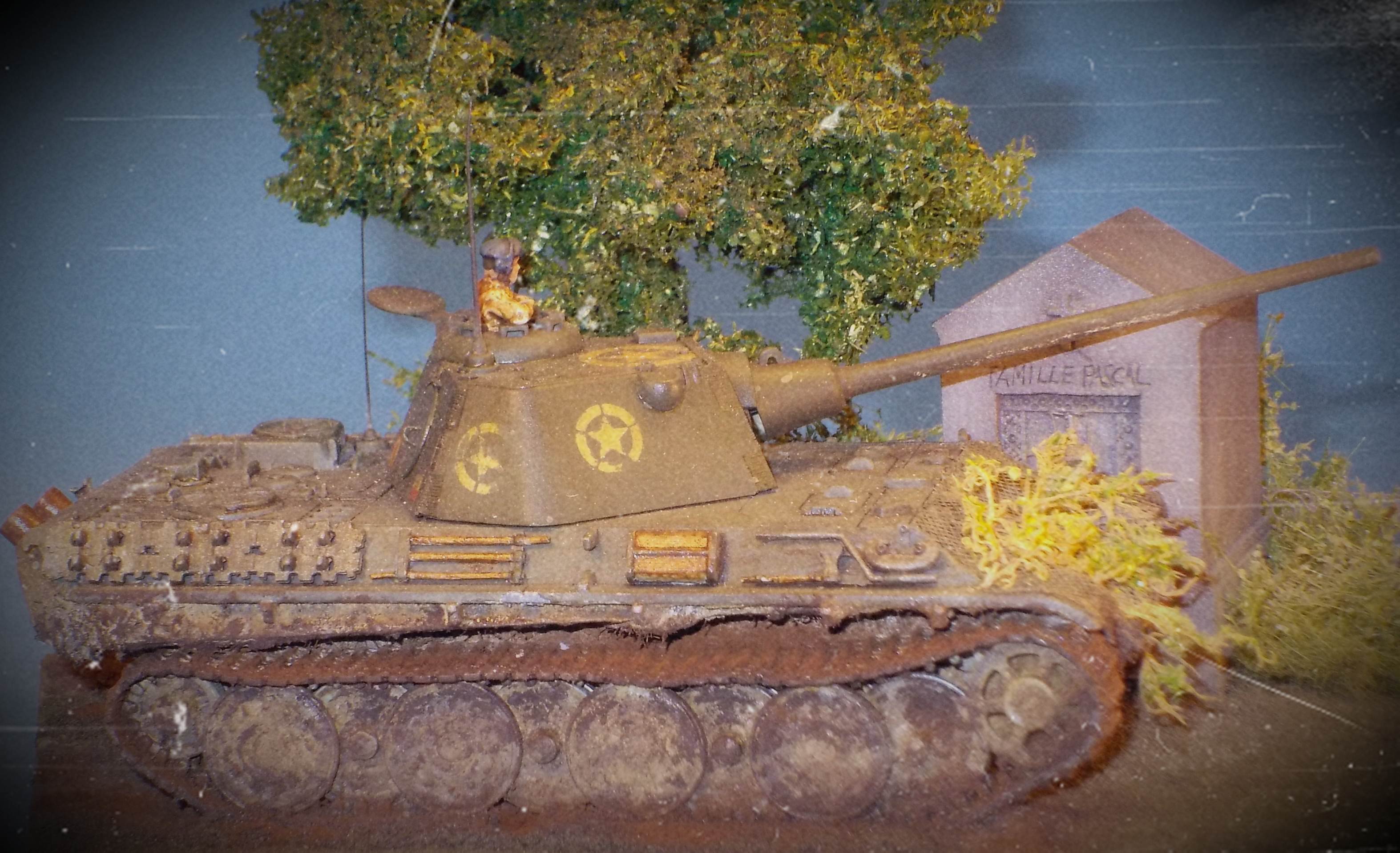fatigue ? I could go on rambling about some other minor shortcomings of the kit, but I believe I have made myself clear by now. The kit is not a complete disaster, assuming it won't disintegrate in a couple of months, but it is typical of a new brand's first efforts, as it was at the time of this release. I am pretty sure the newer Panther kits from Dragon will be infinitely better (and more expensive). I didn't try the kit decals, as I decided to go for a "what-if" paint-job. The figure in the picture is from Milicast set n°5 (yet to painted), the stars are spray-painted using Stencilit and the decals are from Peddinghaus. In the picture aboven the tracks still need to be integrated with the dio I am preparing (which will help hide the gap). I added "chicken wire" to the front glacis to hide the ill-fitting hull. Foliage still needs to be added; dried plants will beu sed for this. The diorama