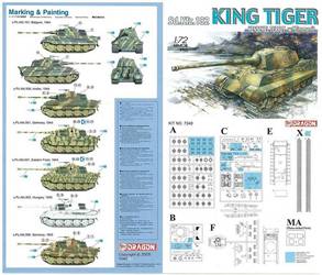 | This kit is a modified release of the earlier King Tiger with Henschel Turret (kit 7246) by Dragon. (Never mind that the earlier kit has a higher kit number.) The main difference is the replacement of some parts by Zimmerited equivalents and the introduction of DS tracks. The upper hull is very similar to that