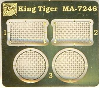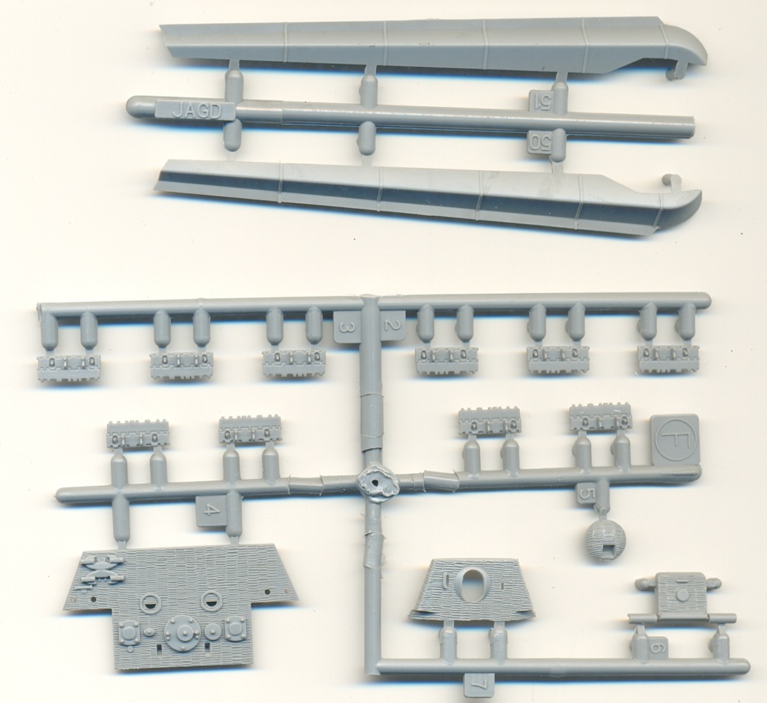 are specific to the Zimmerited kit: The fenders ought to have been the same as in kit 7246, but are not. In my kit they were clearly marked "JAGD", and are too long. Obviously someone put the parts of the Jagdtiger kit into this box. (The fenders in kit 7246 that Doug Chaltry reviewed were marked "KING".) Well, it's better than the other way around and it's not that difficult, I guess, to cut off a centimeter or so from the last section of the fenders. The PE fret is obviously the same as in kit 7246, as it is marked as such. It's very nicely done.
