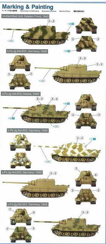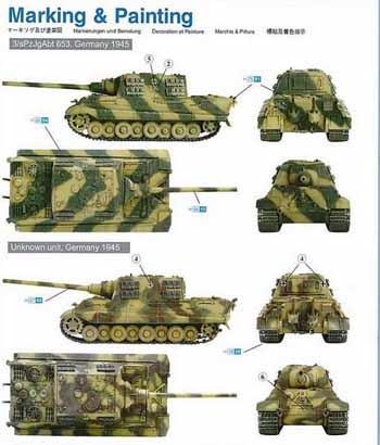 well detailed) vinyl. For some reason 7250 comes with two screws too. Decals are finely printed in both kits. 7250 gives you more choice to assemble your own numbers; you get numerals in black, black with white outline and red with white outline. 7291's decal sheet is more limited. The markings will be discussed in more detail below. The other sprues are technically identical. You only get more spare tracks in 7250 than in 7291 (which is strange as some of them are "not for use" in both kits), while 7291 gives new fender parts with Zimmerit and new hull parts where appropriate. (The non-Zimmed parts are also provided.) The cast texture on the mantlet is very nicely done. Sprue C is common with other Jagdtiger and Königstiger kits, which is the reason quite some parts are "not for use", like tow cables, two (?) MG turret mounts and the MG itself. While not marked as "not for use", you get two (!) hull MG ball mounts, which IMHO are exactly the same. (Had I realized this earlier, I could have used the spare one on another project...). In 7291 you also get a Zimmed ball mount, so we are left with two (...) spare MG ball-mounts. Another large sprue (B) carries the Porsche suspension parts. In 7250 this sprue also has extra spare tracks, which are not mentioned in the manual (neither in the sprue lay-out nor assembly instructions.) A smaller sprue (also labelled "C") gives the typical Jagdtiger parts. You even get a 88mm gun barrel there, for the "mythical" 88mm Jagdtiger (based on a Henschel chassis). Something that resembles a Nahverteidigungswaffe is also included, but not for use. Note that both 88mm gun and NVW are not shown on the parts lay-out in 7250, but are there nevertheless (at least in my kit). The gun travel lock is provided in both traveling and firing position and seems to be the late type with cross-bar. An engine insert is provided for under the engine deck. The engine access hatch is molded open, so a more elaborate engine compartment can be added if one is at hand.