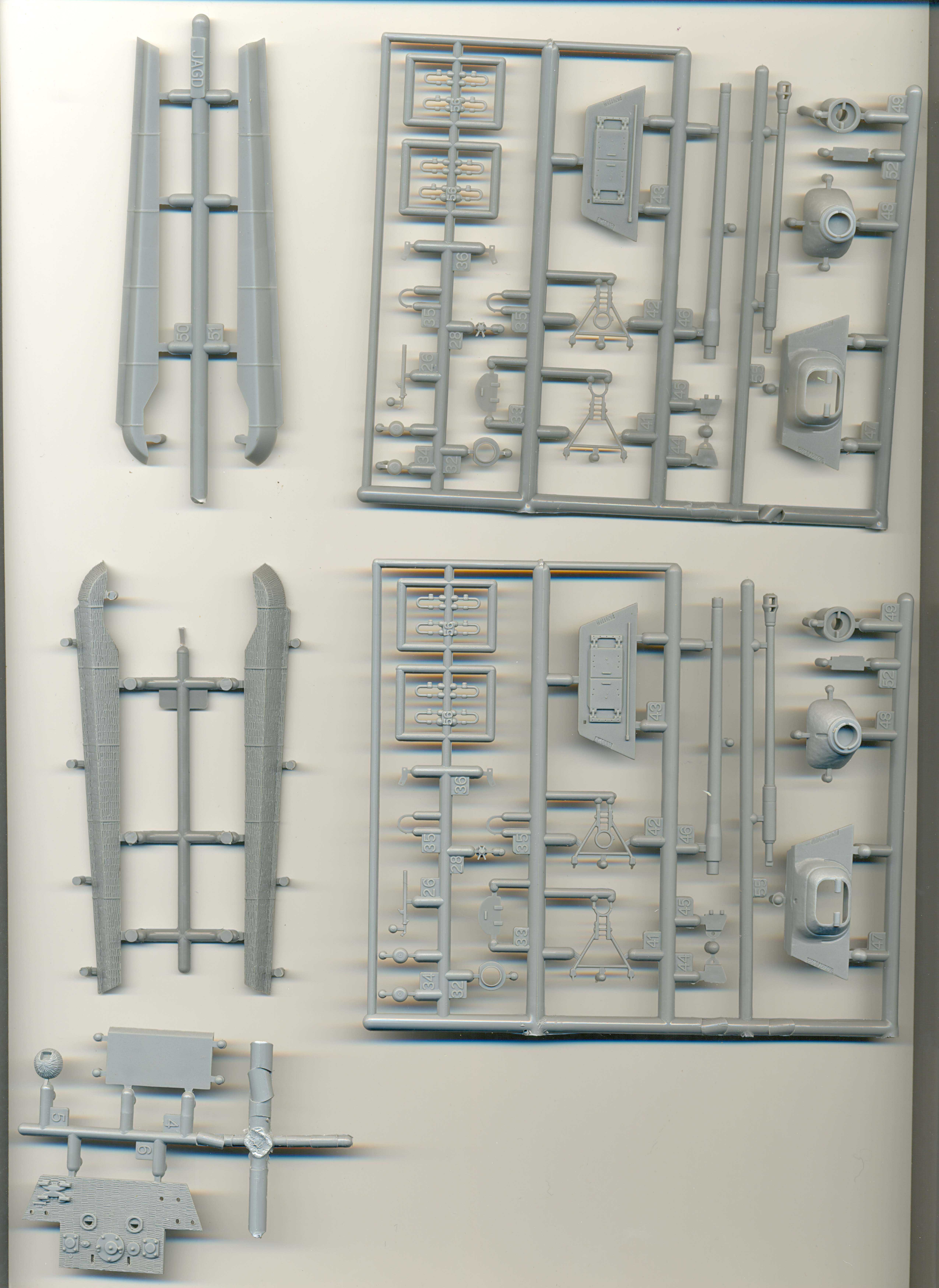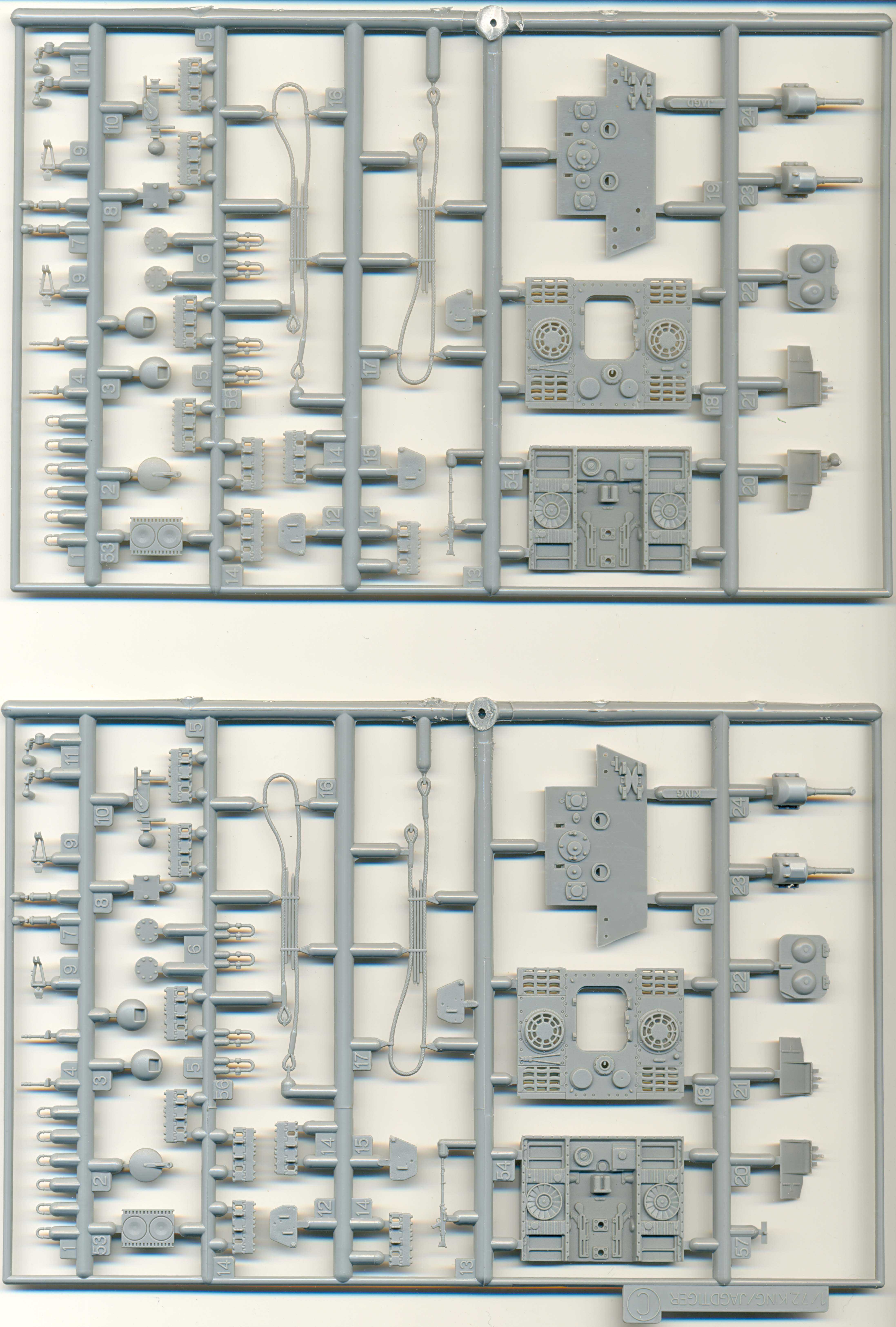 1. The parts The upper hull of 7291 is notably sharper than that of 7250, has Zimmerit, but no attachments for spare tracks or tools on the hull sides. The tools that are molded on the hull of kit 7250 are not provided as spare parts in 7291 either. The lower hulls apparently only differ in the extra notch for the idler that has been added to kit 7291, but for no apparent reason. Both hulls have holes in the bottom which are presumably for the ready-built kits. The driver's hatch is closed, but there is a spare hatch "not for use" in the kit, in case you like to do some surgery. The four crane mounting Pilze on the