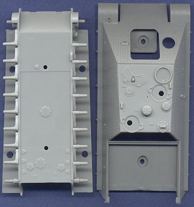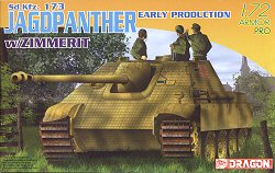![]() Dragon is the most confusing manufacturer I have had the pleasure of reviewing. This Jagdpanther is supposedly the second release in their new Armo Pro series. What exactly is Armor Pro? Well, I no longer know. With the release of their first kit, the Elefant, I thought the Armor Pro series was to have injected plastic, link-and-length tracks and etched brass details. That's apparently not the case. This Jagdpanther kit has the same single-piece vinyl tracks as their Panther kits. Plus, some of their other, non-Armor Pro kits include etched brass pieces, so that also is not a defining factor. Basically, I think the Armor Pro tag is just a hook to try and attract new modelers who are duped into thinking they are buying an "advanced" kit. Not to say that this is a bad kit, which it is not. In fact, aside from one major accuracy error (and the vinyl tracks), I like this kit a lot. The main gimmick to this kit is the molded-on zimmerit, which made its debut with their Tiger I kits. On this Jagdpanther, the pattern is a very fine, waffle-like pattern, which is the pattern that is exhibited on the Jagdpanther currently preserved at the Imperial War Museum, UK. Although on-line photos of the kit make this pattern appear to be very uniform, it is in fact, somewhat varied, and I think it looks pretty good. It will probably look even better once painted. The hull is the same hull that originally appeared in metal for the Dragon Die-cast Jagdpanther, but here it is molded in plastic in order to accomodate the zimmerit. All hatches are molded open, including the engine access hatch. Like their earlier Panthers, this kit includes a flat engine insert for display underneath the engine deck. The wheels and tracks are the same as included with the previous Panther kits. The wheels are gorgeous, and the tracks, although highly detailed, I think are too elastic, and will be difficult to keep from bending in half or to replicate track sag.