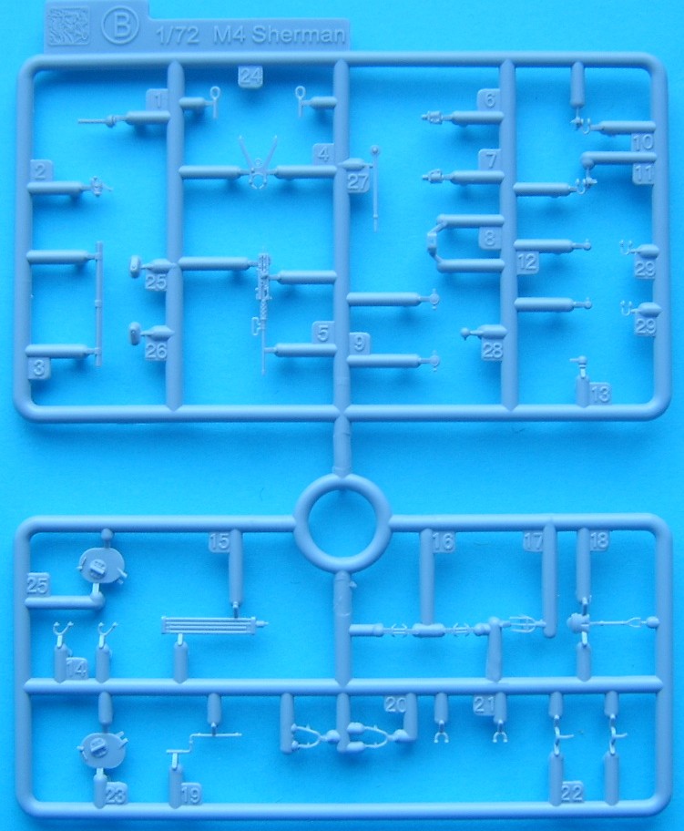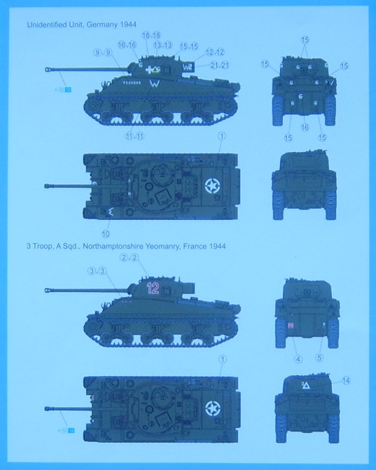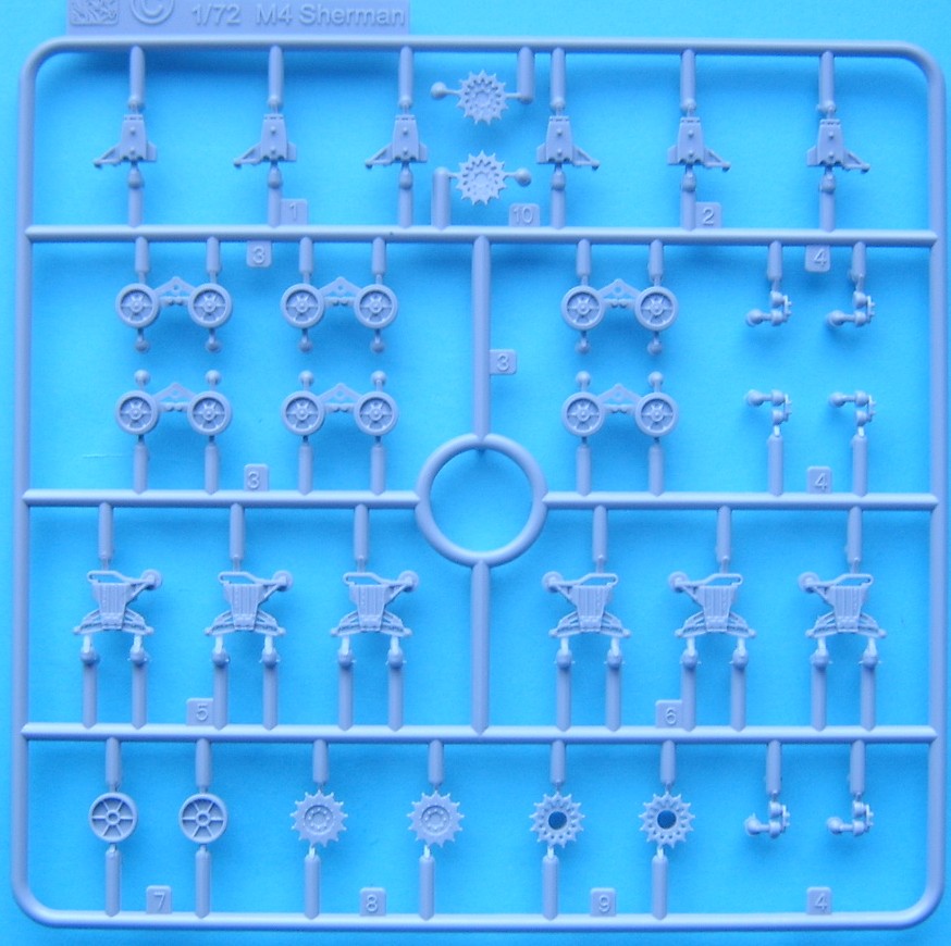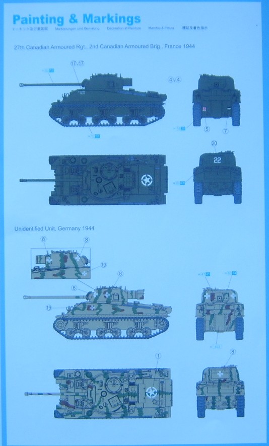 For me personally the most awaited of the Sherman vehicles, well any of the 17pdr versions would do and I am glad to say it was worth the wait. Unfortunately when I got it home I found a problem with one of the sprues and although Dragon have said that they would send a replacement part, I am still waiting, then again to be fair it has been Christmas so the post always takes longer, but without the replacements I can't finish the vehicle. The kit uses the M4A4 hull which is longer than the standard M4 hull and it is nicely replicated with the exception of the moulded on tools ( with the exception of the spade, which is the wrong type for a firefly) The other oddity is the sand shield attachment points have lugs instead of holes, I find it hard to confirm whether this is correct or not and I suspect that it isn't. There is enough PE refinement in the kit to make this into a super model although you will need very good eyesight for some of the pieces, I am sure that Dragon are trying to find out how small they can go !Also included but not used are two .50 cal Browning's although there are only firing handles for one. The kit consists of a new lengthened lower hull A new lengthened upper hull A side view showing the sand shield attachment points The turret with the square loaders hatch, it should be noted that some Canadian firefly's had the oval hatch as found on the M4A3 75mm turrets, the sprue also has the extra armour for the RHS of the turret but this was not fitted to all firefly's. The sprue for the bolted transmission housing and rear exhausts, added hull armour and large stowage bin, you can see how my example has been short shot in the injection process rendering certain parts useless. This is mainly a sprue of spares with only the light brackets ( if you don't wish to use the PE ones) lights and some of the lifting eyes being used. The break down of the suspension is the same as the other Sherman kits The correct steel cleat type tracks are included in the usual DS styrene. An extensive PE fret is included with the light brackets and periscope brackets, plus the manual sighting equipment for the turret as well as hatch latches and handles and the intake grill behind the turret. Decals are provided for 4 vehicles, 1 British, 1 Canadian, 1 or 2 captured German vehicles ? as one set is for an unidentified vehicle. With the exception of the moulded on tools and the DS tracks this is probably the ultimate firefly in this scale and plastic so far, with the inclusion of the PE it makes for a highly detailed model. I recommend this kit for all firefly fan and Sherman fans for that matter. References M4 Sherman Vol II Militaria The Universal Tank, British Armour in the Second World War part 2 by David Fletcher |