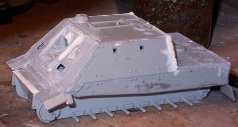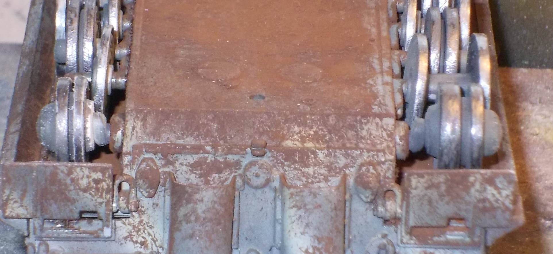 In general, detail is rather soft, heavy and minimal. Notable examples are the track hangers (?) on the side of the hull, which I didn't install. If these were to scale, they could be used to suspend a complete Tiger, not just some tracks. There is a hole in the side of the hull (left side, to the rear) that seems spurious to me, as nothing needs to be fitted there. Conversely, there are no locating holes for the jack. The sheet covers for the exhaust are in brass. They fit rather badly and are handed. The manual would lead me to believe that left and right side are the same, which they aren't. The tracks