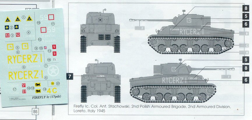 A LITTLE HISTORY FOR THE MODELLER I will not cover much about the history of the Firefly or the M4 Sherman tank here, being covered well in many other books and articles, but I will discuss a little on their service with the Polish Forces. During the Second World War the British supplied both Sherman and Sherman Firefly tanks to the Polish armoured forces serving in Italy and in NW Europe. (It should be obvious that none served with Polish Forces fighting under the Soviets in Eastern Europe.) After conversion from a Sherman Mk I or Mk V to a Sherman Firefly Mk Ic or Vc, they were accepted by the Polish units with the same major modifications as used by UK and Czech Firefly tanks. Field modifications to the tanks at the unit level were also evident. The Polish Firefly Ic RYCERZ I T-270012 is modelled here as it is very well documented in photos and I have available two 1/72-scale models that include the needed decal markings. RYCERZ I is Polish for Knight 1, a tank belonging to the 2nd Squadron, 1st Krechowiecki Lancers of the Polish 2nd Armoured Division that served in Italy. Regarding Sherman terminology, many unofficial terms have been common with the M4 Medium, such as low-bustle turret, high-bustle turret and fancy sprocket. Many of these actually have part numbers such as the D50878 turret. For my reviews I will continue to use the unofficial common names. |