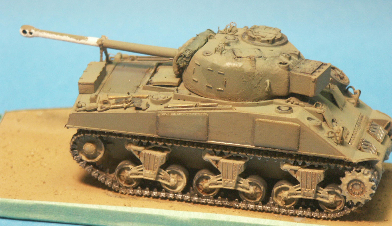 A light tan paint was sprayed over the base and up onto the lower hull, after which I attached browned static grass to the base with white glue to represent a dry late summer field in Italy. Looking at the vertical volute spring suspension (VVSS) bogies makes me think how the detail of the bogies are so often ignored during assembly and reviews, I have done it too. We'll make sure there are exactly 24 bolts around a certain roadwheel and that the kit is exactly 1/72 scale, but it seems like Sherman bogies are just ignored in resignation. For example, take these DML VVSS bogies here, the nice looking stamped type roadwheels are moulded rigid onto the rocker arms and on all the wheels the grease plugs are located in the same orientation of about 12 o'clock. The bracket holding the return roller appears to be an intermediate style with a straight bracket and no raised roller, but the bracket looks significantly too short in the horizontal direction. The bogies just look too big in relation to the size of the sprocket wheel.