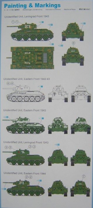 Yet another T-34 release and I am sure that it won't be the last (not counting the SU-85/100 SP guns) this time it is labeled as the cast turret, which is somewhat mis-leading as it is not the cast turret version but a so called formed version or even known as a "pressed" turret or a Stamped turret. Despite it being wrongly labeled it is infact a good representation of the formed turret. The kit breaks down in the now familiar way, with the exception of the wheel choice. The basic vehicle is the same as in most of the other Dragon kits with the exception that the rear access plate is moulded shut. The turret comes on a seperate sprue and includes the hand holds The turret interion is the same as the other T-34 Mod 42/43 hexagonal turret releases and even includes the roof from the German Beute panzer version although regretfully not the cupola to go with it. The wheels selection has been kept to a minimum with just the perforated rubber dished version being in the box although it was usual to see these vehicles with other variations in wheels. for those that have the full T-34 range this shouldn't pose too much of a problem as with careful planning it is possible to get other wheels from the other kits. The tracks are the standard Waffle pattern made out of the "famous" DS plastic. Personally I feel that the tracks are the weak point in these kits, not so much because they are one piece but because they are to my mind slightly too thick. The PE is the standard fret seen in the later T-34 releases and has a good balance of parts that will enhance the kit without going over the top with it. Markings are provided for 5 vehicles, although this time they are missing the obligatory beute version. the decals are thin and in register.