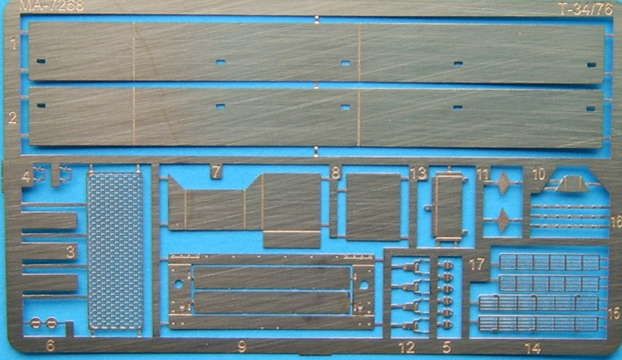 Yet another T-34 from Dragon although funnily not a lot has been said about this one on various forums, probably because nobody could find anything to moan at. The kit uses the same hull and turret as the 42 version. Following the comments about the 42 hull dragon have corrected the hull in this model to a more common version. The kit is basically the Model 42 with added parts for German use, in fact 4 different vehicles can be built, shame that they don't supply 4 hulls to do it with, in fact only 4 options are given in the instructions but other versions can be built from the parts as will be shown The kit uses the lower hull supplied in all the T-34 kits. The kit is essentially the T34 model 42 with hexagonal turret with the exception that the hull has been modified to a more common version. The kit is broken down exactly as in the T-34 model 42 As with the 42 version two turret roofs are supplied, I am still perplexed by the rood on sprue D I have still not found and 42 version with the sights mounted on the RHS Now we come to the best bit, Sprue K contains all the part required for the German versions, in fact it also contains parts to make a Model 41 Beute panzer Included on the sprue are the bins used on the 42/43 model including the jerrycan frame the side bin for the 41 version, a new hatch for the 41 model as well as a PzIII cupola with the option of open or closed hatches. Also included are the notek lights Jack and frame with tools. Contary to what has been said in various reviews in Magazines 4 different road wheel types are provided mainly the all steel and dished, also included are 4 early pattern webbed wheel and 2 late pattern webbed wheels. The wheels althoguh beautifully moulded have one big shortfall, the hole are all closed making for a lot of up. I still ca not understand why Dragon can not do open holes, I can see no logical reason even using slide moulds as to why they are not open?? oh well back to drilling. The tracks are the same and of the correct pattern The usual metal tow rope the PE is a fairly comprehensive set providing the side skirts and one of the stowage boxes in brass, also included is a new fan /radiator cover this time with bolt detail, the louvres for under this are also provided and can be positioned. The PE set also includes all the engine deck intakes, handles for the stowage boxes, details for aroung the tow hooks and a new Notek mounting plate, this set is better than some of the aftermarket sets you can buy. If like me you have the Armo barrels lying round, with a slight modification to the turret mounting they fit perfectly and enhance an already good kit. Markings are provided for 4 vehicles in german service each vehicle is shown in the instructions as a different option and a small table is provided to show what fits on which version. This must be the most complete T-34 kit in this scale, in fact I know it is, the options provided supplies lots of parts for the spares box. Nice to see that Dragon have changed the hull for the more common type, although people will still moan about the DS tracks (which can always be replaced with the UM ones which I find the best Plastic tracks) and although these kit (here in the UK at least) are slightly more expensive than others, add the cost of buying a kit and a set of PE together and they work out very cost effective.