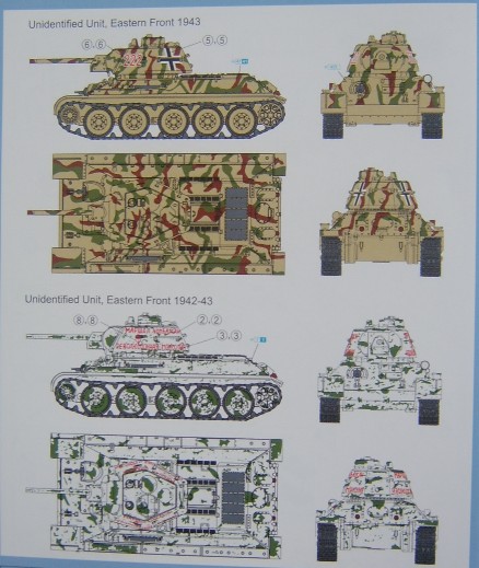 | Finally after the wrongly labeled T-34/76 mod.43 Beute have dragon released the proper kit, the Mod 43 being distinctive by the addition of the commanders cupola to the turret. The kit is the same as the original Mod.42 but with the corrected hull. The only new sprue is for the cupola itself and that the wheel selection is different, included are only 6 steel wheels 4 spider and the rest being the normal perforated rubber solid dish wheels. The break down of the kit is the same as the other T-34 kits, or better said the Mod.42 and Beute kits as the rear access panel is moulded shut.Again the option is there for either the PE engine mesh or the plastic is there, at least the option of having it in the kit is better than the option of purchasing an aftermarket item that unless it is for the specific kit won't fit. The turret is basically the same as on the Mod.42 and the Beute, with the exception of having a new roof for the commander cuploa and the 2 periscope sights The internal turret sprue is the same and contains the gun breach and outsid hand holds. As already mentioned the whhel selection differs from the Mod.42 with the inclusion of the Dished wheels and not so many steel, however there is enough to make the kit and some spare depending on which vehicle you want to model. The tracks are the standard waffle type, it is interesting to note that Dragon must have various moulds for the tracks as they come in a variety of lengths depending on which kit you buy, which is odd as all the kits have the same distance around the wheels, the lengths vary from between a little tight to too much slack where links have to be removed. The PE provided in the Dragon kits is some of the best I have seen, not only is it thin and in scale, but it is also not over done and all parts are usefull so that the fret is not full of gimmicks that are never used, of course it is up to the individual as to how much PE he/she wants to add, as the kit can be built without. Markings are provided for 4 vehicles of which one is the now obligatory "beute Panzer " The decals are well printed ans suitably thin and should set down well. References used Russian T-34 battletank by Horst Schiebert Schiffer publications T-34 in action By Steven Zaloga and James Grandsen Squadron/Signal Publications T-34/76 1941-1945 by Steven Zaloga And Peter Sarson Osprey New Vanguard NVG009 Unknown T-34 Russian Publication so I can't understand a word but great drawings and pictures Tankomaster Hull Drawings M-Hobby Hull and Turret drawings Plus Various other russian Publications that when I find out what they are called in English I will add to the list |