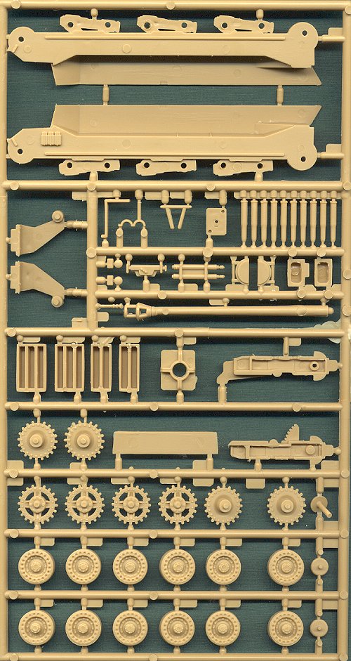 The real drawbacks to the kit are the wheels and tracks. As was typical of many of ESCI's models, the wheels were molded as single, double-wide wheels, instead of the pair of very slim wheels that they should have represented. Considering the high visibility of the wheels after construction is complete, this oversight is very apparent on the finished model, and looks quite poor. The tracks are horrible, of course, unless you buy the ESCI/Ertl version of the kit, which includes hard styrene link and length track, but even these are only mediocre, because the inner surface is bare to accomodate the solid wheel pairs.