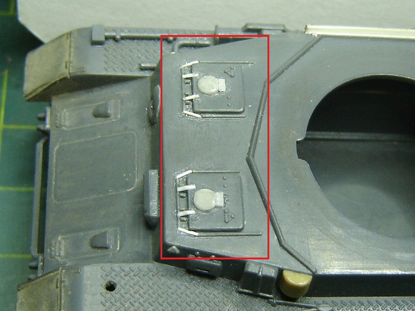 be correctly shaped in this photo). Weld lines from HSP (Heated Stretched sPrue) are faintly visible as is the very small hole next to the left vision port. Viewed from the front, the gun mantlet is slightly offset to the left. |