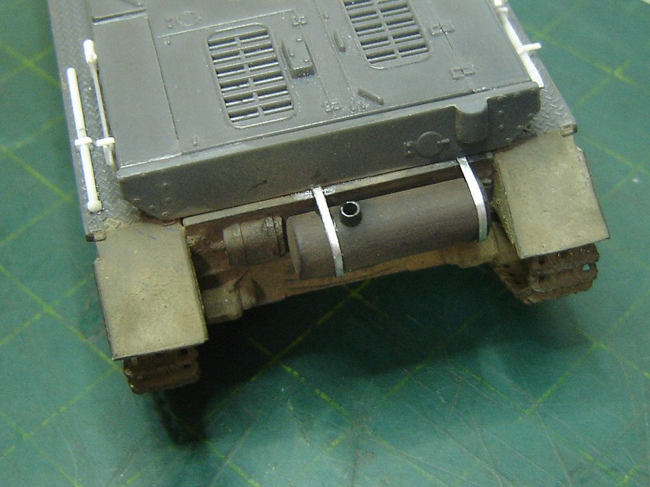 | The missing auxiliary generator is built from scratch and placed on the left side of the exhaust muffler. Strapping for the muffler is made from thin lead foil, all modifications shown in photographs below. | |