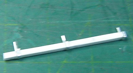 side of the hull. I made this rack by cutting a small length of thin copper sheet; the third, light-ochre, roadwheel comes from another Pz IV Esci kit. The three roadwheels are held together with a bit of plastic strip glued between them to help their alignment on the rack. |