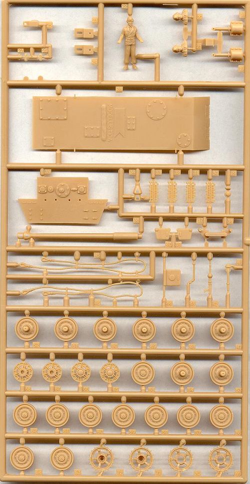 The hull and turret are extremely detailed, with the hull in particular, exhibiting detail that is considered top-of-the-line in today's kits. The hull has open hatches, and the turret has the commander's hatch open, but the loader's hatch is molded shut. The tow cables are molded as separate parts, which is surprising considering the age of the kit. Most kits back then (and even some today) had the cables molded in very poor relief onto the hull. Three crew figures are included, a complete commander figure, and two identical busts for the hull postions. The figures are outstanding; with detail equaling that seen on the newest figures from Preiser.