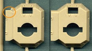 There is also an error with the shape of the rear superstructure. On this, and the following two kits, a couple of "corners" have been added to the rear of the superstructure, where it should actually be smooth plate, continuous with the sides of the rear hull. The following scan shows the offending portion of the kit on the left. On the right, I've done some photo-editing to show approximately how the hull should really look. It was probably easier to do the fix in the photo than it will be to actually do it on the plastic, although with care, it shouldn't be too difficult.