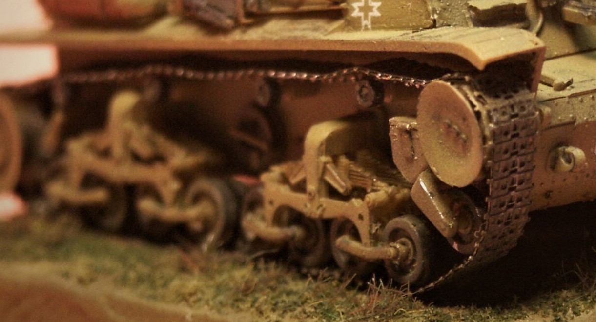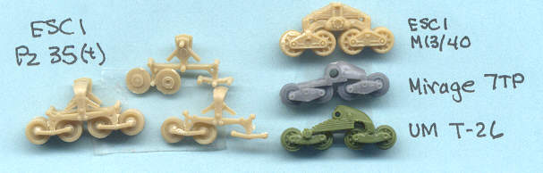 The Pz 35(t) suspension bogies (at left) appear very complex and were essentially the same as those used in the French Somua 35 tank, the Hungarian Turan and Zrinyi tanks, and the British Matilda 1 tank, and the bogies bear a resemblance to that on the British Vickers 6-ton and Italian M13/40 tanks. Please be aware that the leaf springs on the ESCI kit bogie (far left) are mistakenly mounted upside-down and this slipup was rectified prior to final assembly of my model.