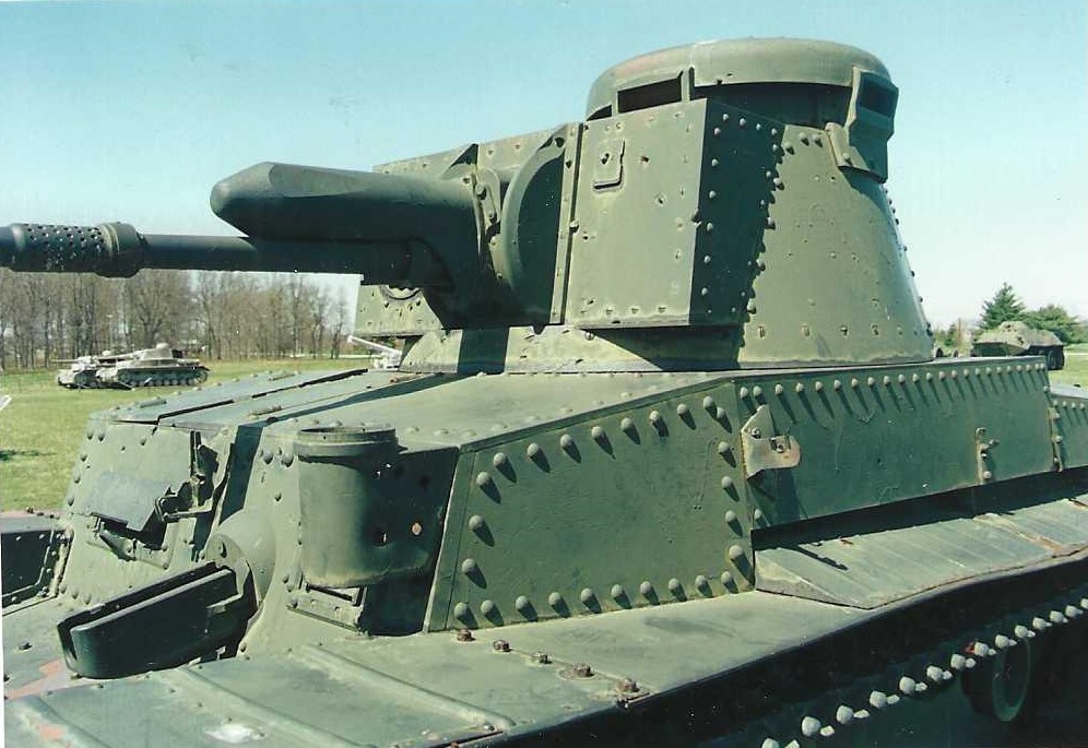 This is the Pz 35(t) at Aberdeen Proving Grounds. At the top we have the commander’s cupola with four vision devices and large pan-shaped cupola hatch. On the side of the tubular armored recoil cylinder note the flattened area on the side and then the 37-mm gun barrel and pepper-pot muzzle break below. Left of the gun (our right) is a small vision flap (perhaps for the gun sight?).