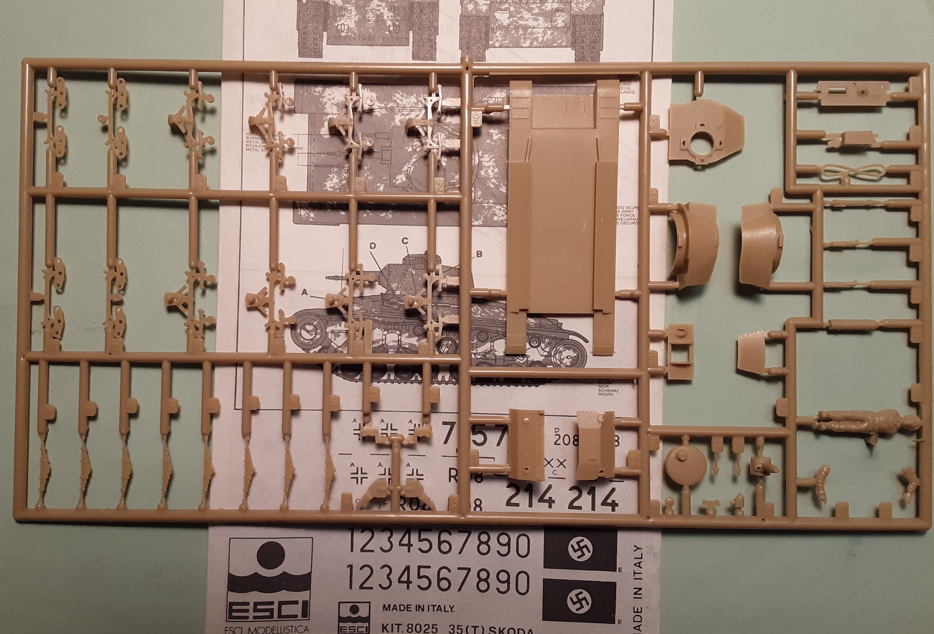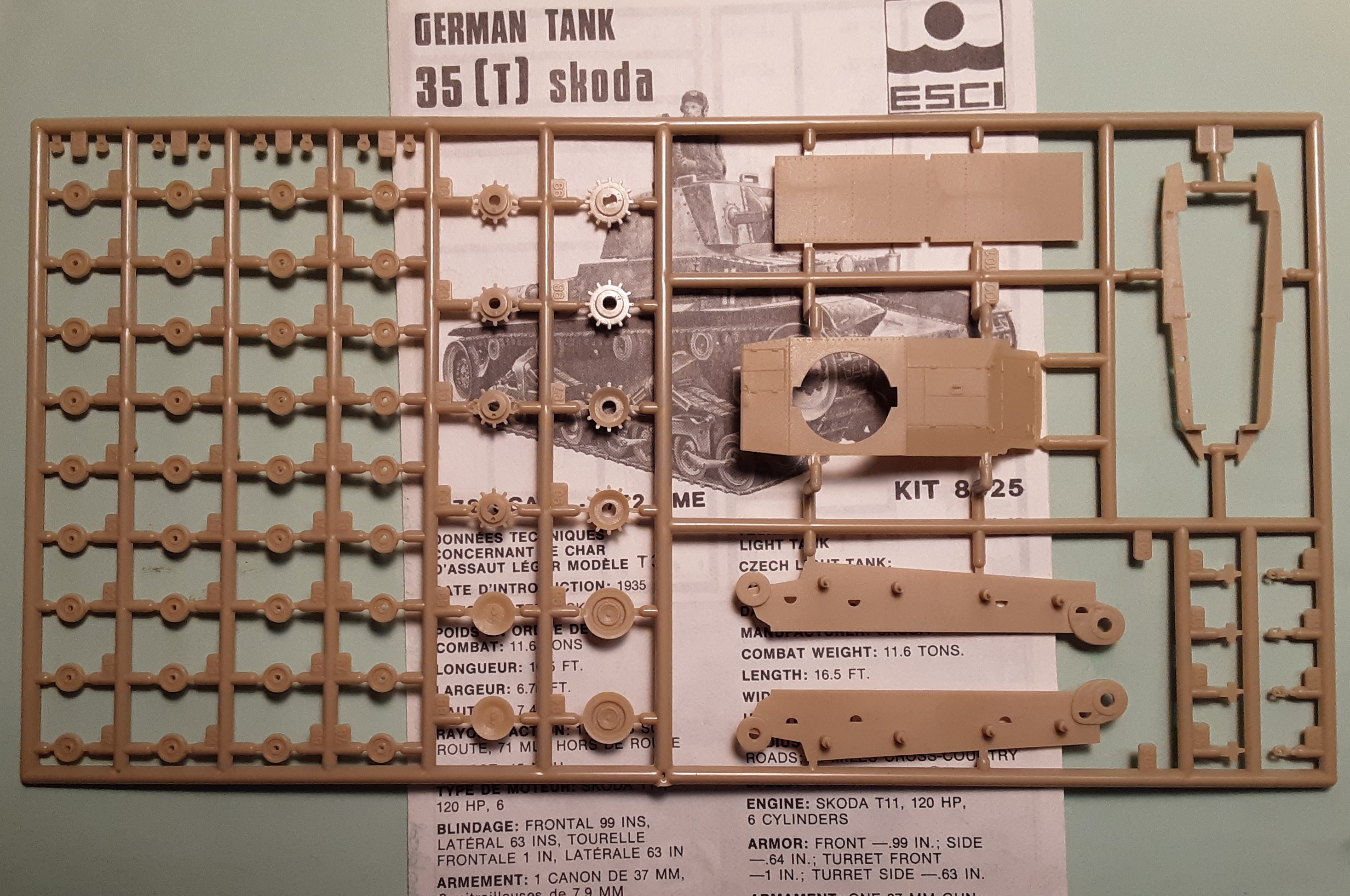 I counted 116 tan colored injection-molded styrene plastic parts on two sprues, and two crude, stiff, polyethylene plastic track that resists most glues. This is an old model kit before slide molding technology but is complex and one of ESCI’s best kits. One figure is included and no resin nor etched metal parts.