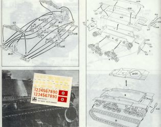 The kit instructions are the typical exploded-view type with a parts tree diagram, several historical photos of the Pz 35 in action and a 4-view drawing noting markings and painting. Study the assembly of the suspension bogies well: “dry fit twice and glue once” as they say, or something like that. At lower left are the water-slide decals released by ESCI for a German Pz 35(t) which includes several flags for draping on the engine deck for air identification.