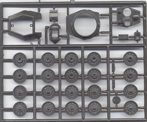 The two ESCI kits share the same hull, and differ only in the wheels and turret. This later version, the Model 1943, comes with the all-steel wheels, and the hexagonal turret. (I show two scans of the top and bottom sides of the hull sprue, but of course, only one hull comes in each kit.) This is also called the Model 1943 in the Ledwoch book, because the turret has a commander's cupola.
