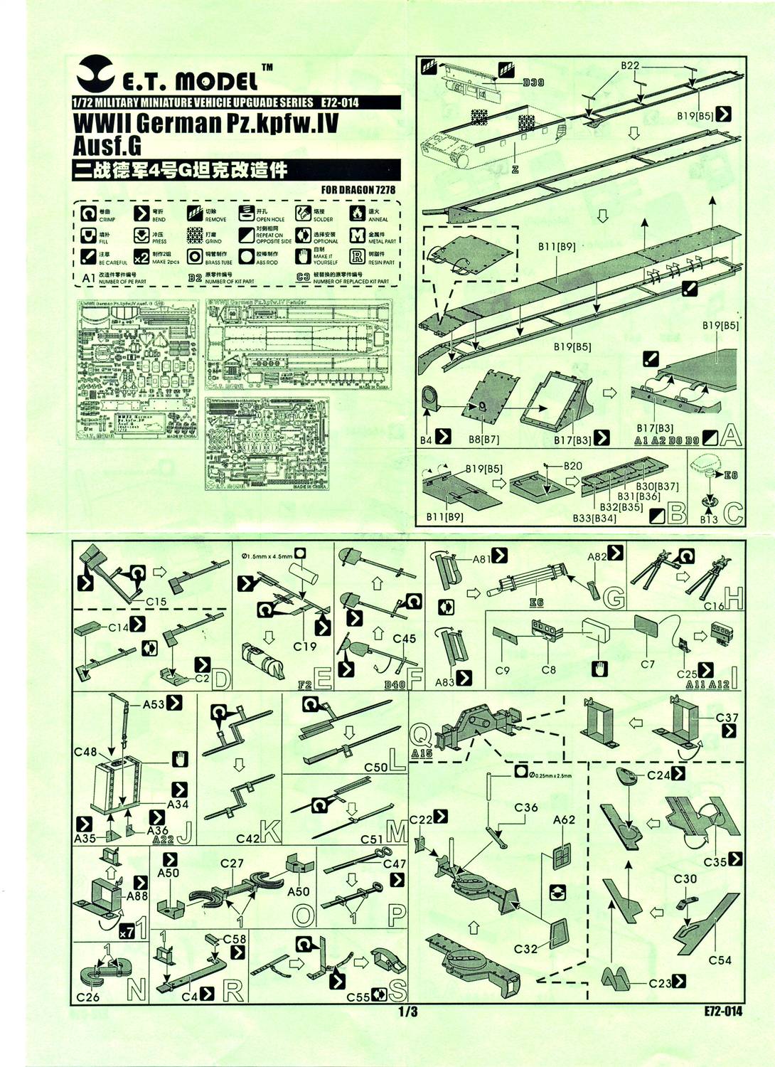 This set is basically similar to its sister set for the Panzer IV Ausf. F1 (with which it shares two of the three PE sprues), except that it is meant for Dragon's Panzer IV Ausf. G (kit 7278) and has some different parts, which are mainly limited to the bolted armor and smoke launchers. I therefore refer to that set for more detail comments and to the enclosed pictures for the differences. |