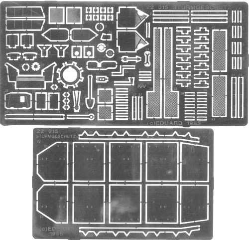 This excellent set contains a plethora of useful parts (except the pioneer tools). It also provides the option of building a late version of the Stug IV with optional loader's hatch, MG shield and exhaust pipes. Some of these parts can also be used on other kits, such as the late MG shield on the ESCI Jagdpanzer 38 (Hetzer), and the late exhaust pipes for late versions of the Panzer IV. The instructions are pretty decent.