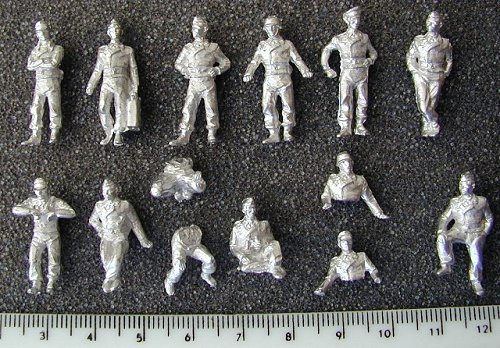 12 metal figures: 1x with jerrycan, 6x crew/commanders standing, 2x Crew/commanders seated, 2x with torso and legs in kit form.