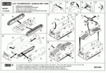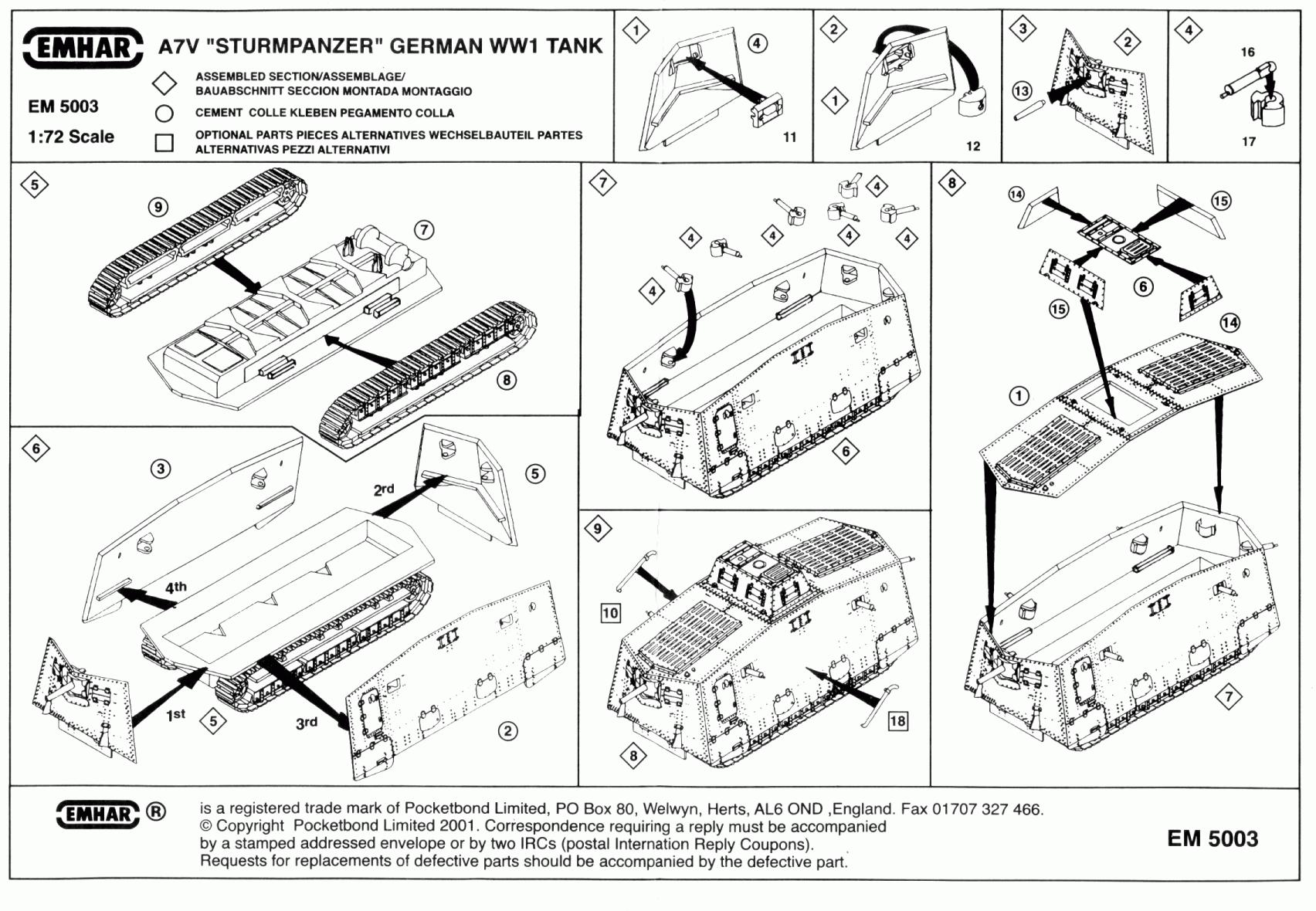 The plastic is a dark grey and fairly soft. Fit is reasonable though all the joining surfaces for the body panels will need some sanding to get a better join. Even with that I found there were the odd places where I had to apply some filler and sand. This must be done very carefully so as to not remove too many rivets. The kit was basically built straight from the box, with a few minor modifications to make it a bit more accurate. The Landships web site provides a some good info on the A7V and was quite helpful in identifying the changes. I was also able to get my hands on a copy of the excellent book, “The German A7V Tank and the captured British Mark IV tanks of World War 1” by Maxwell Hundleby & Rainer Strasheim, published by Haynes Publications in 1990. This book is a must read for anyone who has an interest in the A7V and captured British Mk. IV tanks used by the Germans, and even more valuable for the wealth of pictures and history on the A7V and its kin. From my references I found that the early A7Vs did not have exhaust pipes nor the foot steps beneath the doors, so the exhaust pipes (parts 10 & 18) were not mounted and were tossed into the spare parts box, while the molded on foot steps were shaved from the body’s side panels. My kit had a prominent seam on one of the track units that I tried to remove as best as I could without creating a flat spot along its length. The rear faces of the bogie units (parts 8 & 9) are molded hollow. I covered these over with some plastic sheet and built up the assembly to resemble the front side of the bogies. I didn’t put too much detail on these as they are mostly out of sight when the tank sits on the ground. The teeth molded on the front idler wheels were removed. I also added axles from some plastic rod between the drive sprockets on the bogies and the transfer case at the rear of the body pan (part 7). The barrel for the forward gun (part 13) was drilled out. Take care while assembling the front gun mount as shown in Steps 1 and 2. The instructions direct the builder to put the mount in backwards. I didn’t notice this until I had glued it in place. Then I had to cut it out of the hole in the body and put it in the proper way. The machine guns are molded so as to be moveable. Since I had no desire to have moveable guns, all of the machine gun mounts (part 17) were glued in place to the body panels to ensure there was no chance they would fall into the body when I added the guns later. To ease construction I cut excess plastic from the small balls located on the rear of the machine guns so I could slide them into place in the gun mounts and glue them after all the painting was complete. Replacement door handles were fashioned from some thin wire. Decals are not the best but are usable. The white on the images is a dirty off-white and not a nice pure white, plus the vehicle names are bit too large compared to what is shown in the A7V photographs I found. The decals did snug down well after a few applications of Microsol. Markings are provided for 4 tanks (note that the comments inside the square brackets are annotations that I have added from info found in the Hundleby & Strasheim book) : 1. A7V #506, Mephisto in early markings, skull and