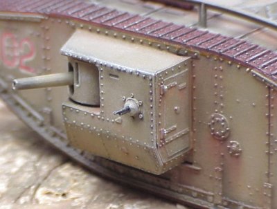 I finally got my camera fixed so that I can post this review. I built this model a couple of years ago, and I have absolutely no references on World War I tanks, so I cannot comment on the scale or detail accuracy of this kit. According to the dimensions included in the instruction sheet, it scales out exactly to 1/72nd. Emhar produces only two 1/72nd scale armor kits, this one, and the closely related Mark IV "Female" tank. The "Male" is armed with a pair of 6-pounder cannons in the side sponsons, and three Lewis water-cooled, or Hotchkiss air-cooled machineguns, while the "Female" is armed only with machineguns.