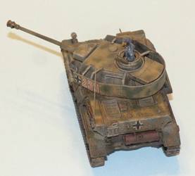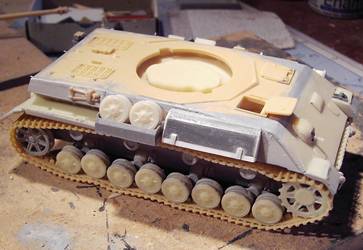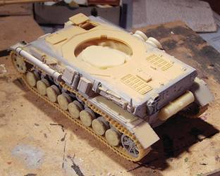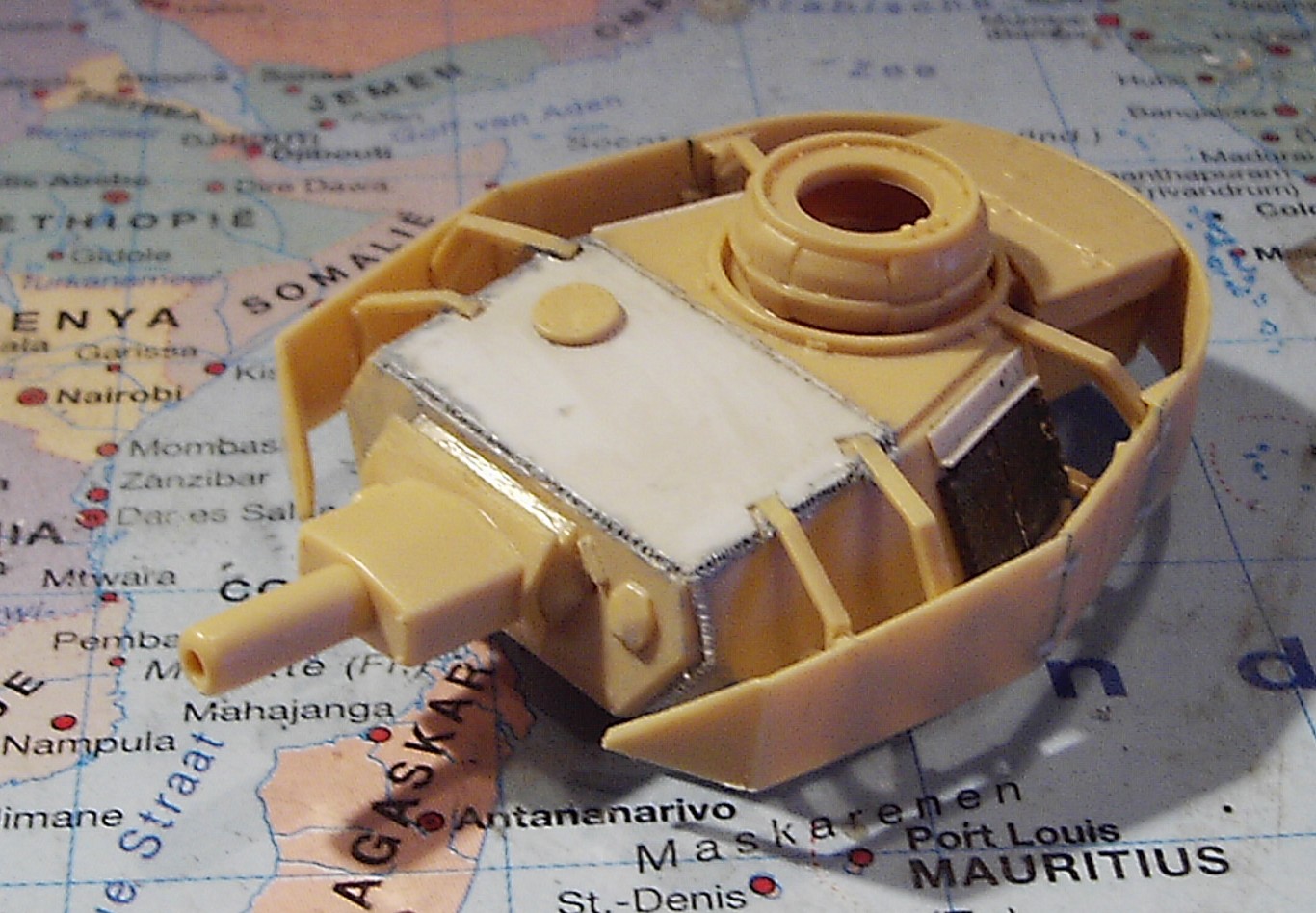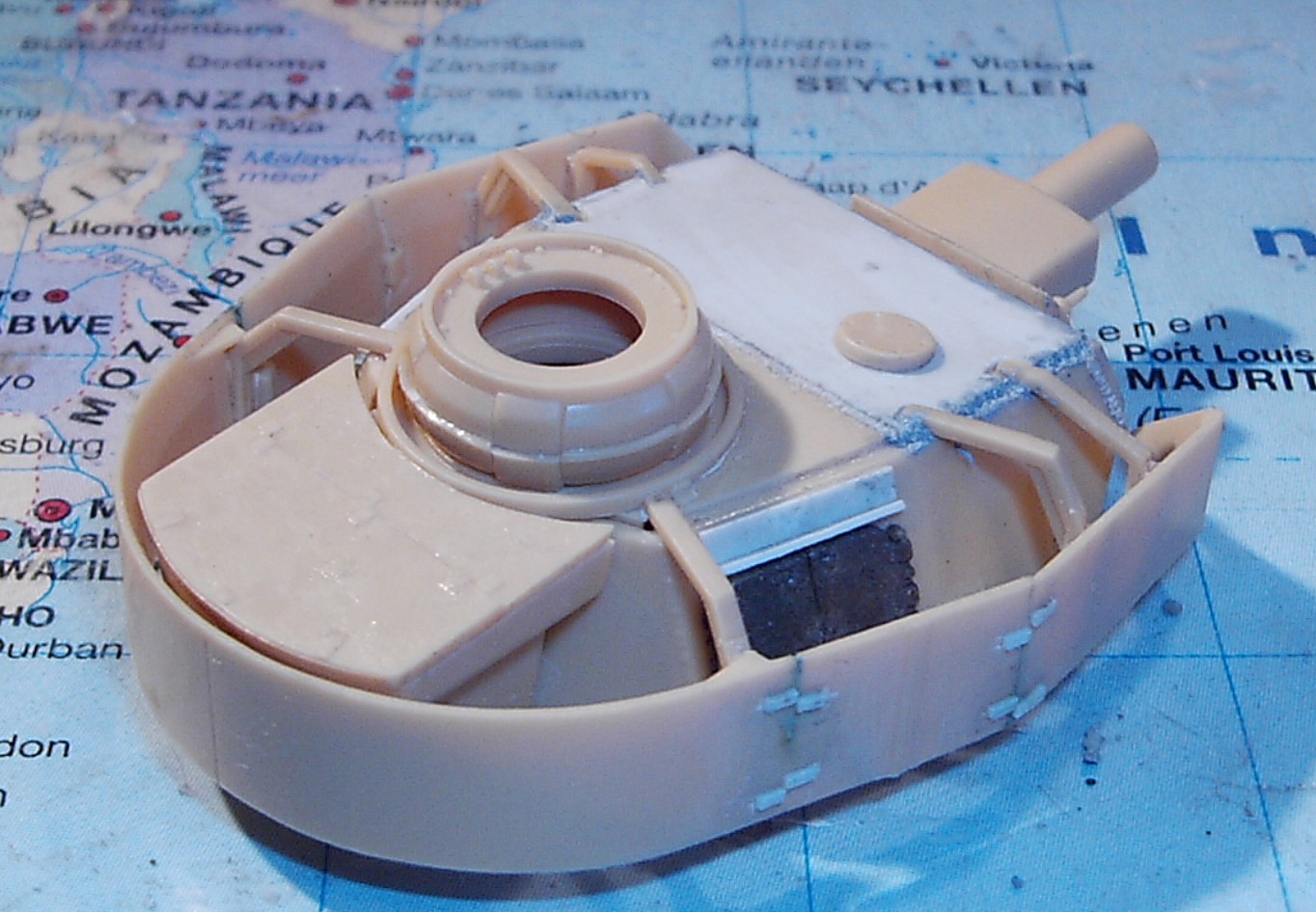 8. Construction The turret of the Euromodel kit is basically a one piece Revell turret without a Rommelkiste and with a closed hatch. As I got a partial Revell Panzer IV kit that was donated by Andrew Smith, I used the turret thereof, as it allowed me to open the hatches and add the Rommelkiste. I added turret doors from the spares box (the donor kit was lacking them), extra armor on the turret roof from scratch, a rainguard above the turret doors from scratch, and enhanced the welds and hinges. After first installing the Revell barrel for the KwK I finally substituted it for another gem: the Armorscale metal barrel. To get rid of the concave hull top I sanded down the top of the resin hull and transplanted a Revell hull top. Various extra items were fitted that looked "cool" to me. Spare tracks and roadwheels, tools, boxes, tube holding the cleaning equipment for the barrel, a jerry can. I decided to use Dragon tracks, which