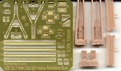 This set was an absolute surprise to me. It doesn't really fit in with Extratech's other series of detail sets, vehicles, or figures. But, it is an absolutely wonderful, and I am very glad it's available. The machine guns are the same spectacular weapons included with their M8 and M20 Armored car kits, but with infantry tripod mounts instead of vehicle mounts. Also included in the set are two bazookas (anti-tank rockets), with the main tubes cast in resin, and the details in etched brass. this will make excellent accessories for stowing in halftracks and placement in dioramas. Although the etching is high grade, I am sure that the gun mounts would look better being replicated in 3-dimensional rods, instead of the flat brass parts.