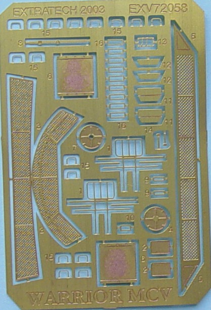 | This set is designed for the Revell Warrior MCV. A very nice set, it includes new turret and side hull baskets with the mesh pattern going in the right direction unlike the kit pieces and although the hull basket is not 100% correct it is a vast improvement over the kit piece. Also included is a much needed periscope detail for the drivers hatch, which includes the wiper blades, rather than having a flat surface as the kit, in fact the set includes periscope detail for all the turret and hull periscopes. With all the handles around the hull nand the latch for the inside of the commanders and gunners hatches, the set completes itself with new headlight guards, presumibly you will have to cut away the moulded on guards on the kit pieces for these to fit, although the instructions are a bit unclear on this. The final pieces are new mudflaps and covers for the Raven sights on the turret and of course the omnipresent on British vehicles, the cable reel. A recommended set that will enhance an already good kit and corrects some of the flaws present in the kit. There are a few other parts that I feel could have been included which would have enhanced it further without getting too difficult. If you have a Revell Warrior you need one of these sets, Along with the PDI brass barrel.and even the PDI interior and the CMSC kit and you nearly! have the perfect Warrior. References Warrior British Combat Vehicle Tracked by Carl Schulze Concord publications Warrior Mechanised combat vehicle 1987-1994 by Christopher Foss Osprey New Vanguard Warrior Company By Simon Dunston Europa Militaria No25 |
