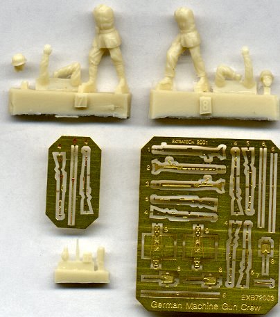 ![]() This is a set which seems to me to have some unrealized potential. It includes four figures, two each of two different poses, one of each of which is shown in the scan above. There is also a set of personal gear for each figure (one shown in the scan) which includes the canteen, bayonet, mess tin and gas mask container. On the etched frets are four Mauser rifles with straps, an MG-42, two MG ammo boxes and three spades. On the plus side, the figures are very well-sculpted and detailed. The heads and personal equipment are really quite nice. My main complaint is the lack of variety. Basically you get two figures to use in two different dioramas (unless you want duplicate figures in the same dio). And even then, these two poses, although different, really look quite similar. The modeler is allowed a little room for modification, by swapping arms, and positioning the arms and heads differently, but more poses would have definitely been better. I have seen the previews of ExtraTECH's other two figure sets on Sandman's and Overlord's website, and I agree with their assessment that this one here is the best of the lot. Hopefully ExtraTECH will notice a difference in sales between the sets, and produce more like this one in the future. |