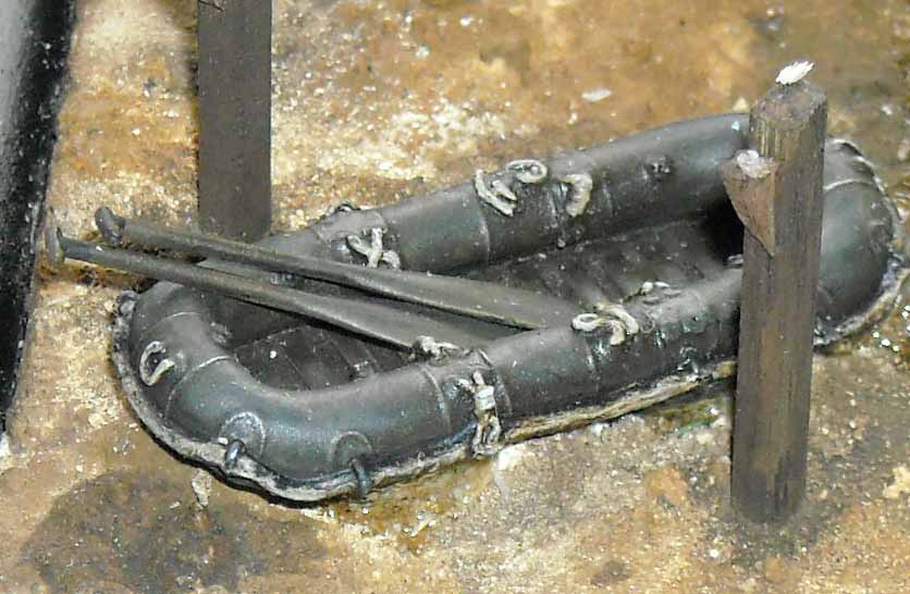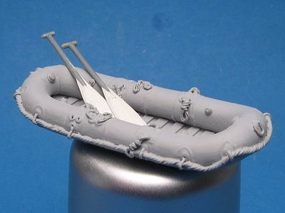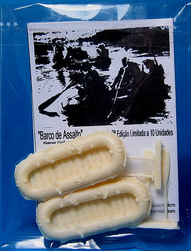 ![]() Picture by FBMinis, used with permission 1. Packaging: Small sealed plastic bag. 2. Type of kit: Stand alone resin kit. Very limited production run. 3. Quality: Casting quality is very good with nice detail; small parts on a sprue. 4. Contents The set consists of two rubber assault boats and four oars, all in resin. 5. Instruction sheet: Nihil. (Not really necessary either.) The boat respresents a "Kleine Flossack 34". 6. Decals and painting options: Nihil. 7. General Impression: Very good. With enough of