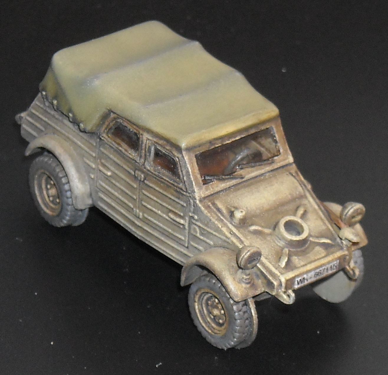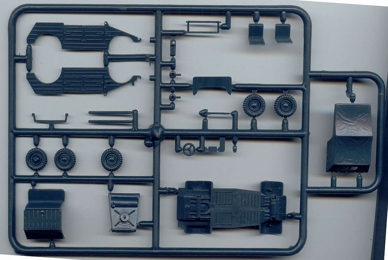 I left off the following parts that come with the Italeri kit: wheels, canvas hood and windshield. The spare wheel was also left off and the mount hollowed out to represent the real thing.