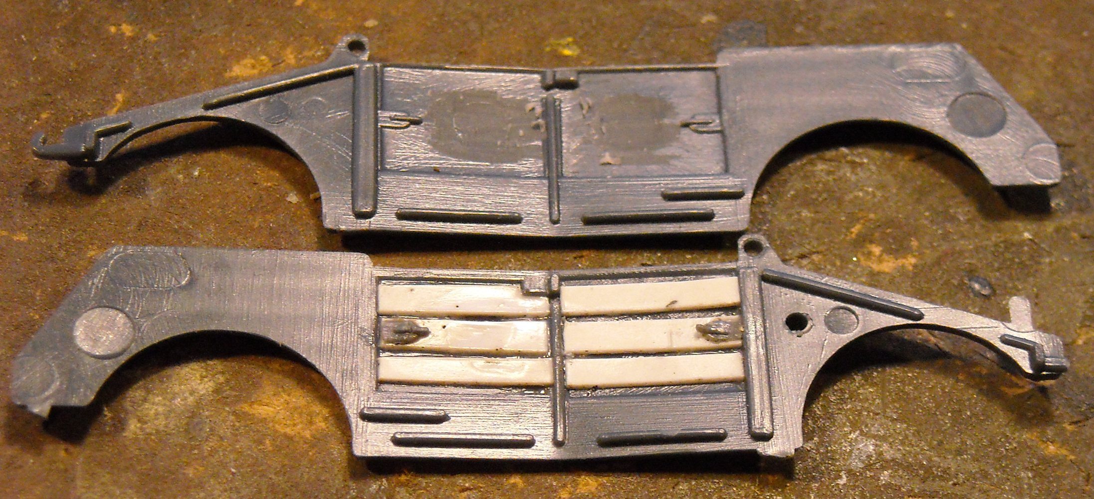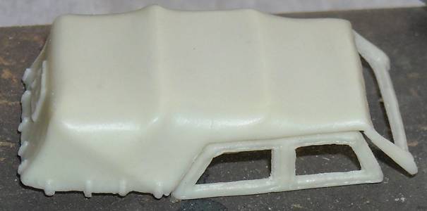 The straps at the rear of the canvas hood (which is a very nice piece, by the way) were sanded off and replaced by short strips of aluminum foil, as I felt these would give a better fit between the hood and the body of the car.